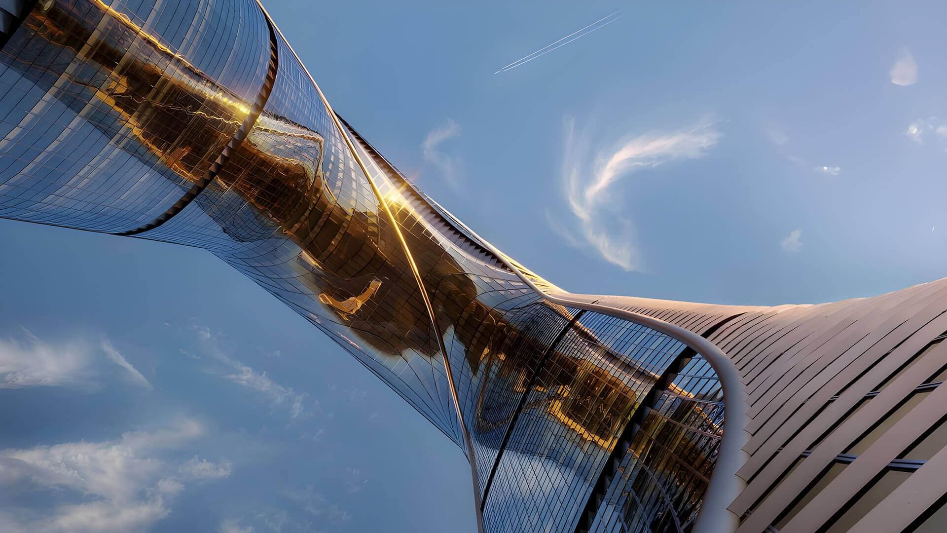 После завершения строительства эта башня станет самым высоким жилым зданием Европы и новой архитектурной доминантой делового центра Москвы. Этому способствует и необычная форма: в виде буквы «О». Плоскости фасадов формируют подобие ленты Мёбиуса, символа бесконечности и непрерывности. Плавное перетекание подчёркивает переход от прошлого к будущему. На уровне 85 этажа разместится ландшафтный сад под открытым небом — самый высотный в Европе. Башни соединит небесный мост со стеклянным полом.