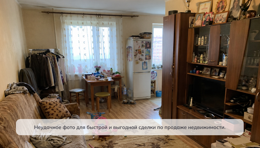 Не стоит чрезмерно ретушировать фото. Покупатель все равно увидит реальное состояние на показе. Допустимы коррекция света, горизонта и баланса белого, но не удаление трещин, плесени, труб или дефектов отделки.