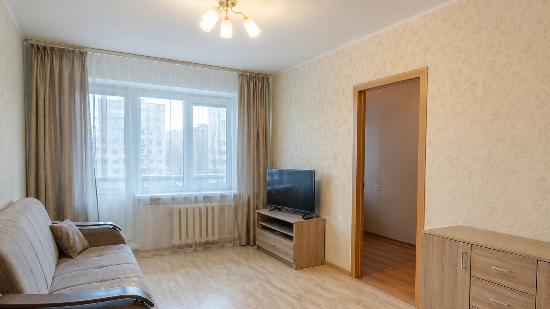 Гостиная. Освободите поверхности, поправьте текстиль, уберите провода, откройте шторы. Покажите зону отдыха так, чтобы было понятно, как ей пользоваться.