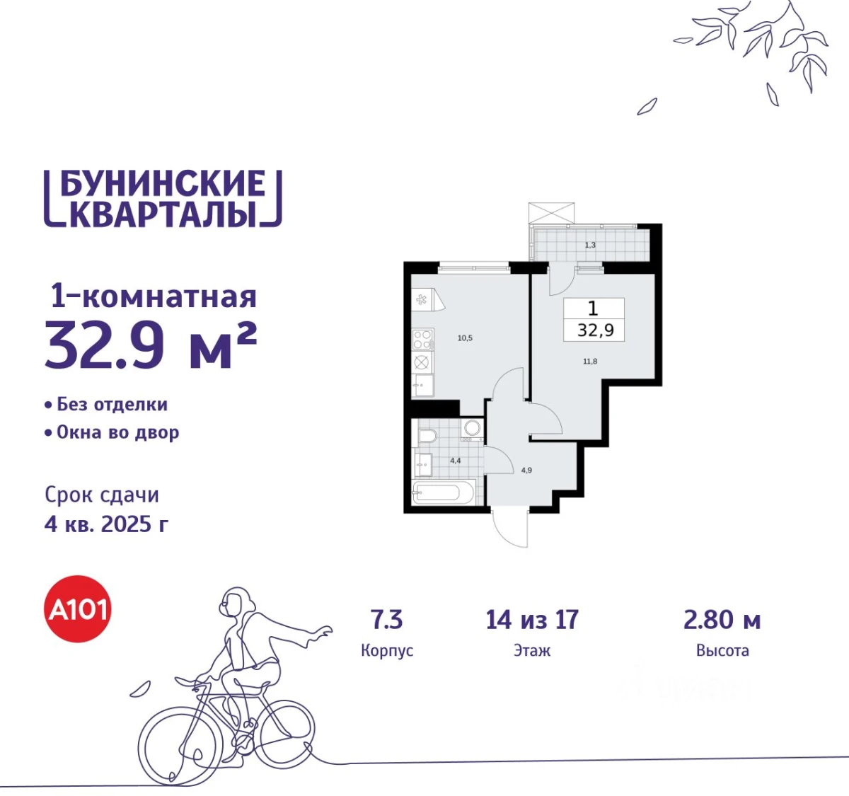 Продается 1-комнатная квартира в ЖК Бунинские кварталы - по цене 10 400 019 ₽ от застройщика А101. Находится по адресу: Москва, пр. Куприна, 7 к1 возле метро Потапово в районе Сосенское. Общая площадь квартиры - 32.9 м². Этаж 14 из 17.
