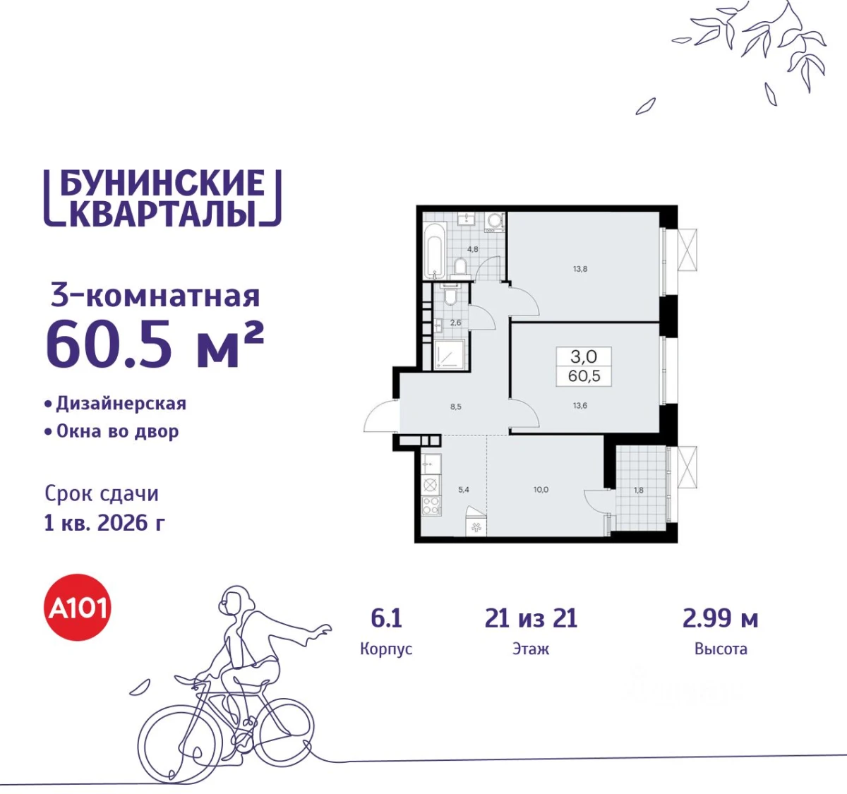 Продается 3-комнатная квартира в ЖК Бунинские кварталы - по цене 22 945 835 ₽ от застройщика А101. Находится по адресу: Москва, пр. Куприна, 7 к1 возле метро Потапово в районе Сосенское. Общая площадь квартиры - 60.5 м². Этаж 21 из 21.