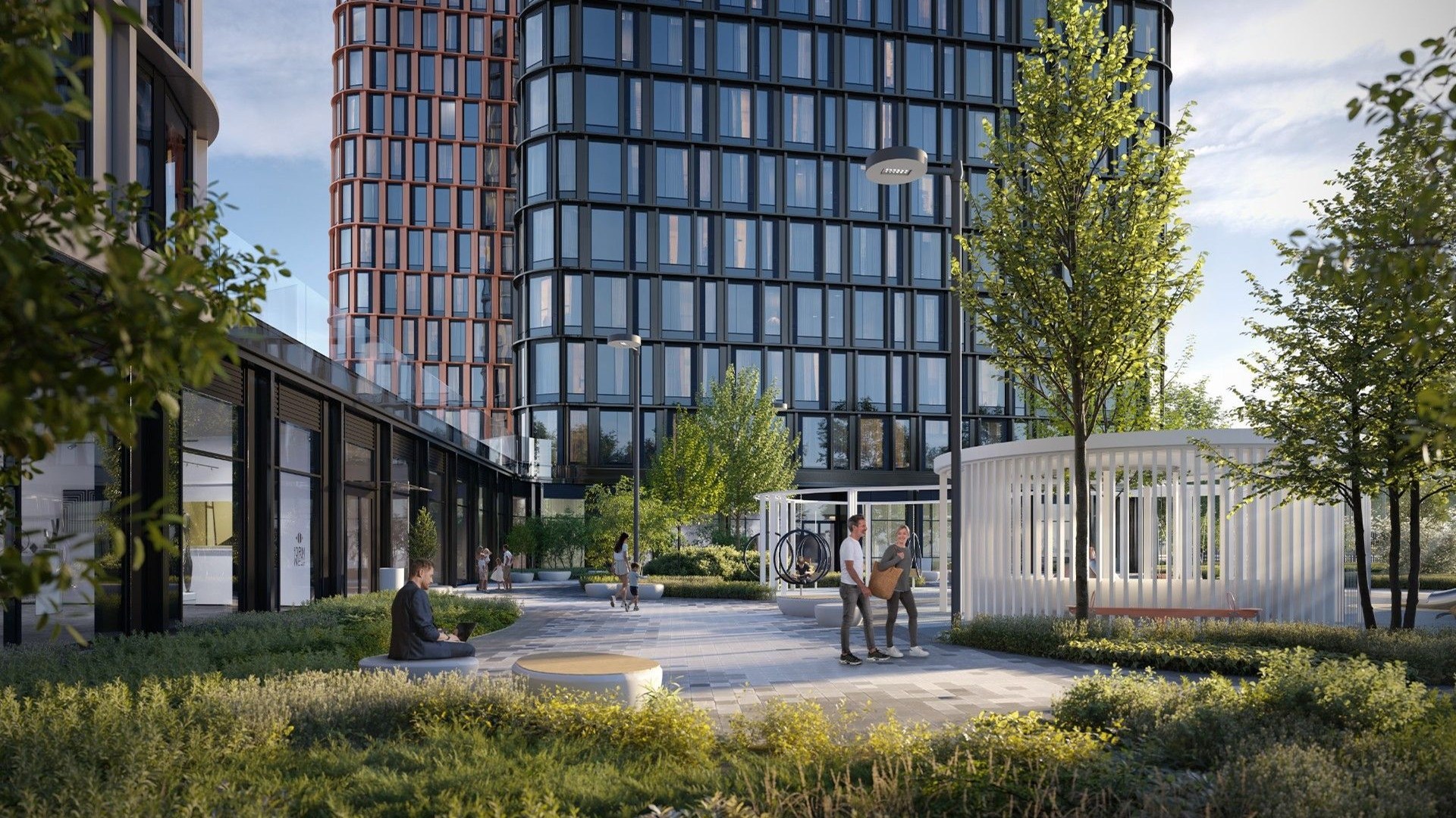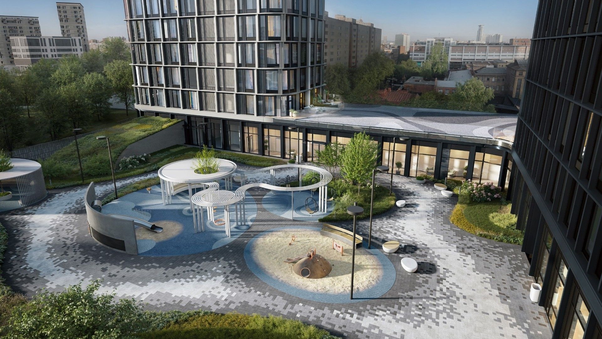 Огороженная территория организована как приватный зелёный двор. На территории — детская и спортивная площадки, лаунж-зона с качелями и тихие уголки для отдыха. В лобби предусмотрены детский клуб и помещения для хранения колясок. Парковка размещена на двух подземных уровнях с системой доступа.