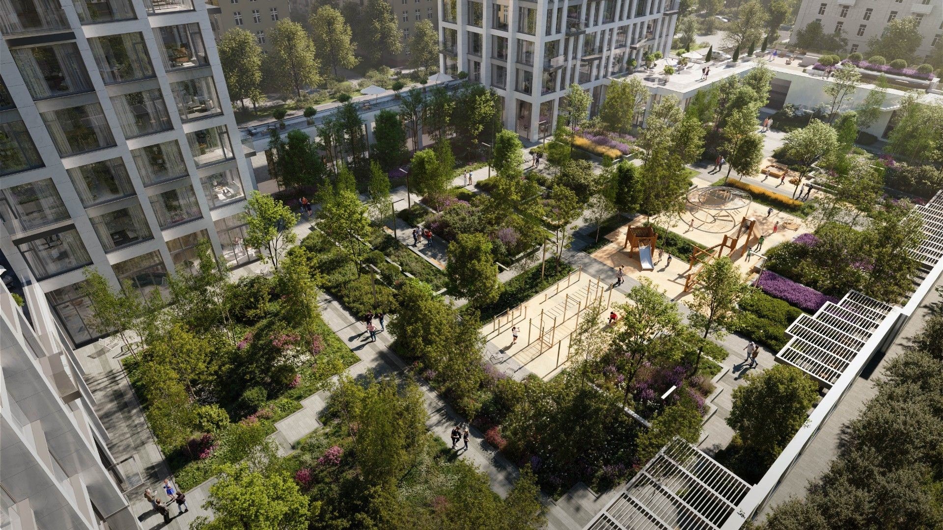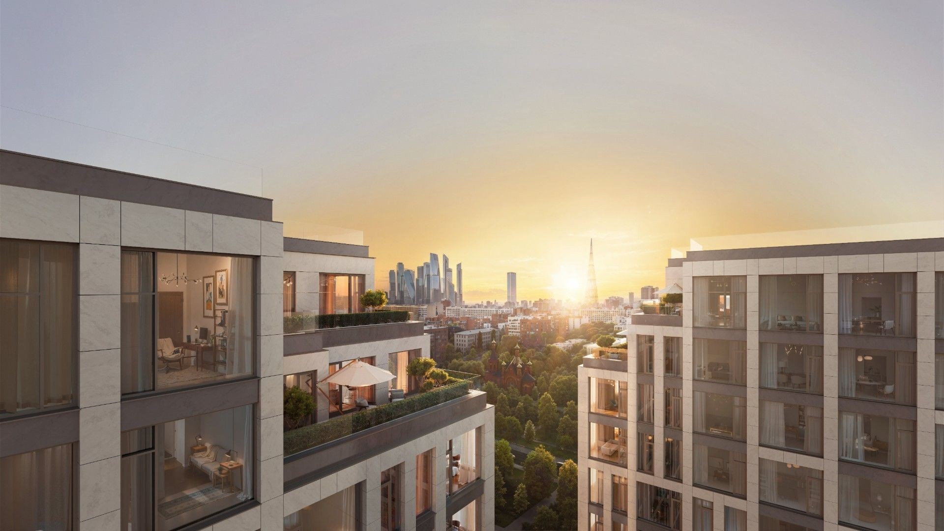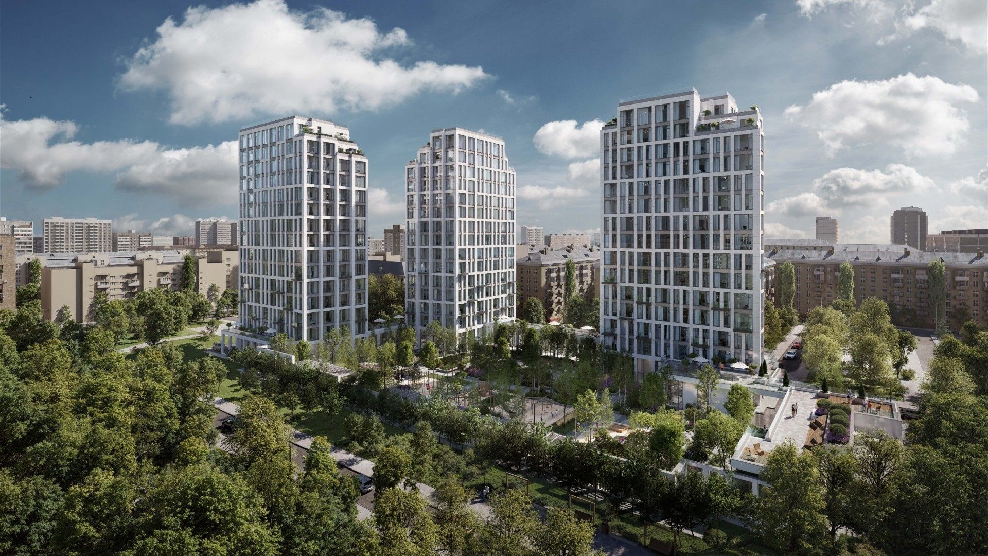 Автор архитектурной концепции — бюро «Остоженка». Строгий фасад выполнен в нейтральных оттенках, панорамное остекление наполняет квартиры светом, а французские балконы и террасы придают облику комплекса лёгкость. Внутренний двор площадью 1 га превращён в ландшафтный парк с тенистыми аллеями, местами для прогулок, отдыха, спорта и детских игр. Приватная атмосфера сочетается с высоким уровнем комфорта и уединения.