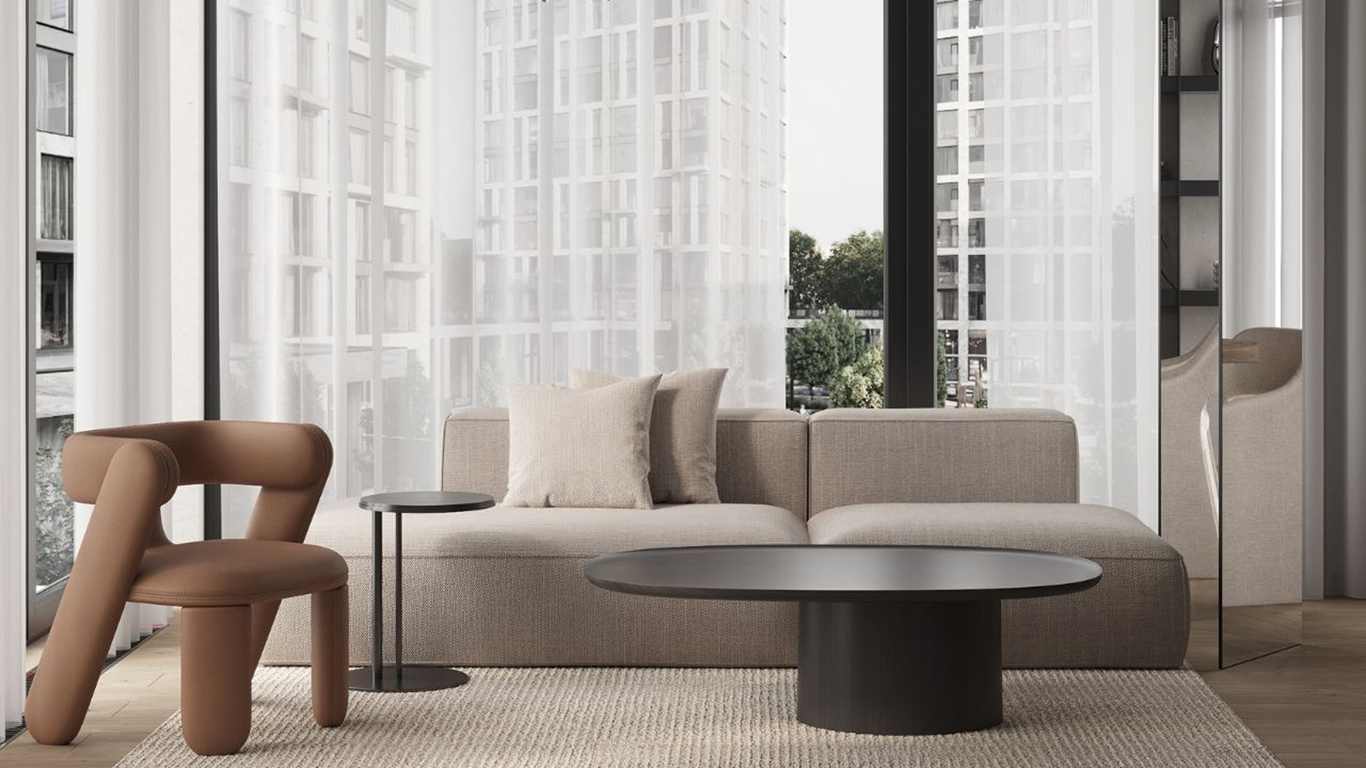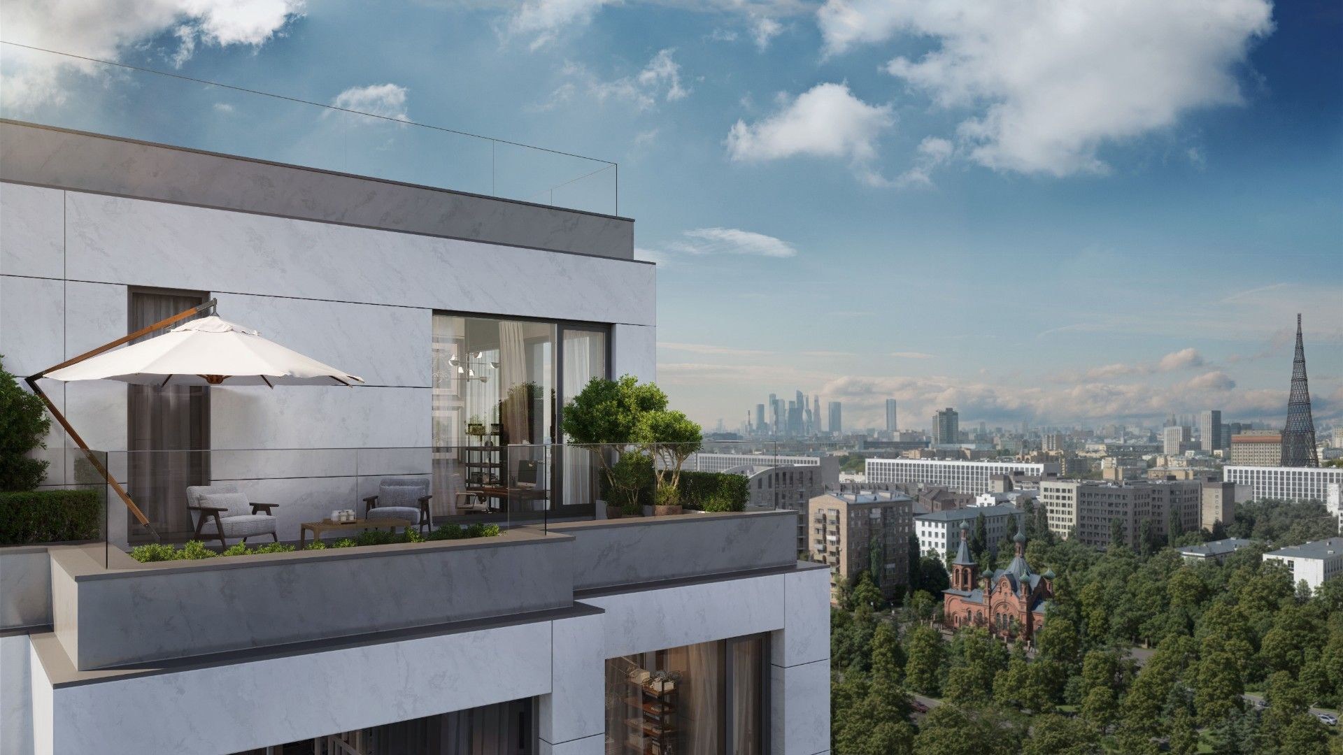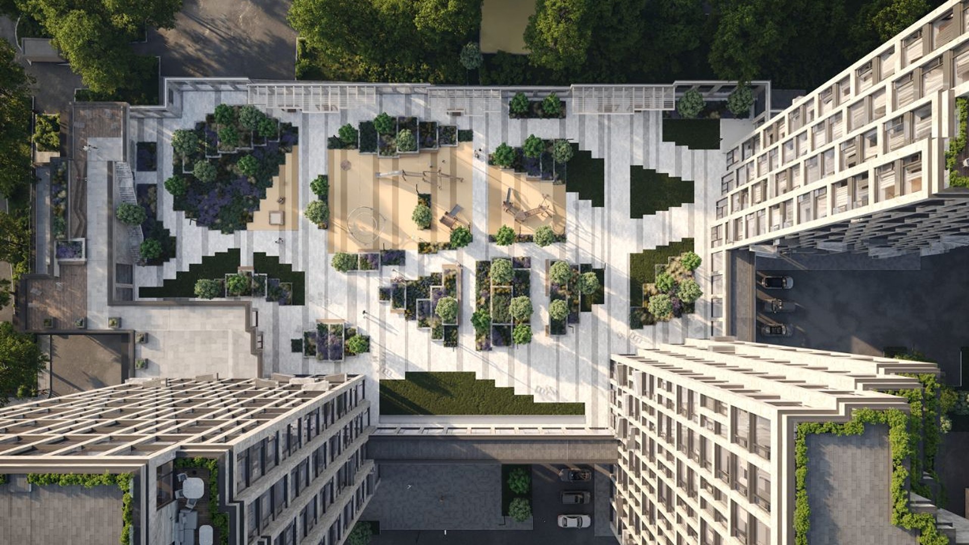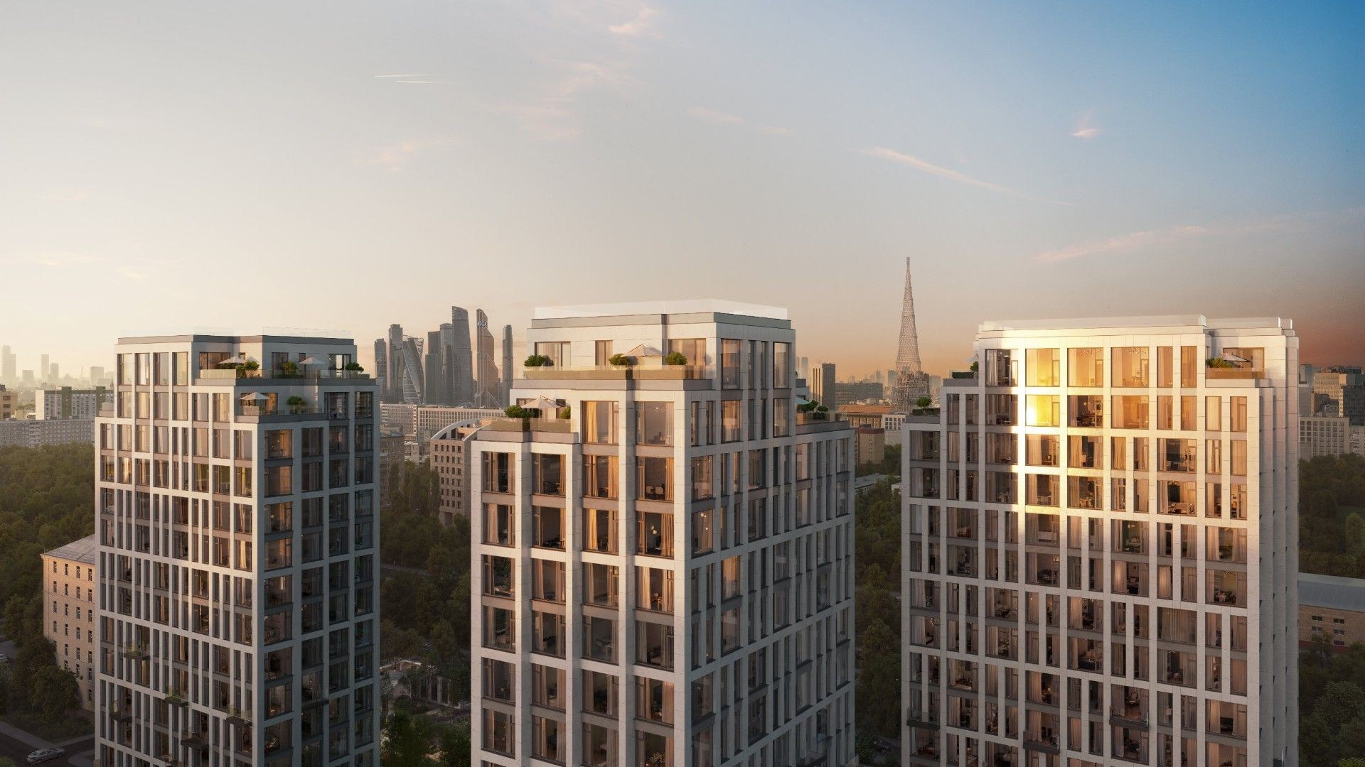 Автор архитектурной концепции — бюро «Остоженка». Строгий фасад выполнен в нейтральных оттенках, панорамное остекление наполняет квартиры светом, а французские балконы и террасы придают облику комплекса лёгкость. Внутренний двор площадью 1 га превращён в ландшафтный парк с тенистыми аллеями, местами для прогулок, отдыха, спорта и детских игр. Приватная атмосфера сочетается с высоким уровнем комфорта и уединения.