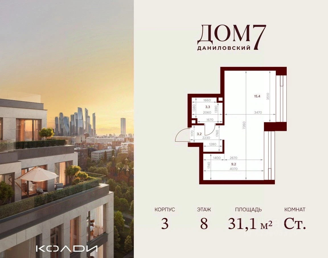 Продается студия квартира в ЖК Дом 7 Даниловский - по цене 30 107 910 ₽ от застройщика Колди (Coldy). Находится по адресу: Москва, улица Серпуховский Вал, 7 возле метро Тульская в районе Даниловский. Общая площадь квартиры - 31.1 м². Этаж 8 из 15.