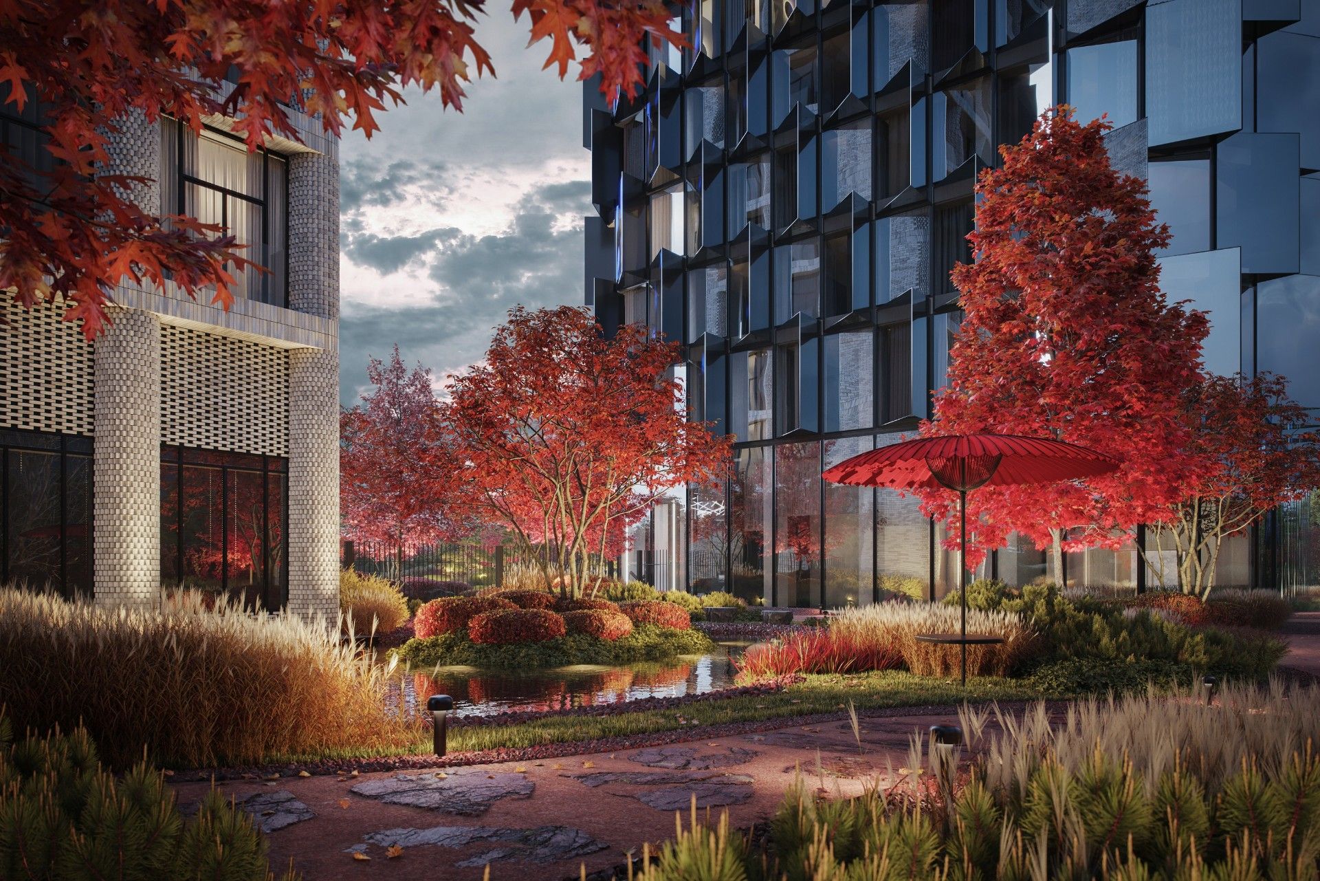 На закрытой охраняемой территории будет реализована концепция «алого сада» от японского архитектора Хироки Мацууры. Внутренний двор украсят фонтаны, арт-объекты, игровые и спортивные зоны от Playground. Также откроются кафе, супермаркет, сервисные службы и семейный ресторан.