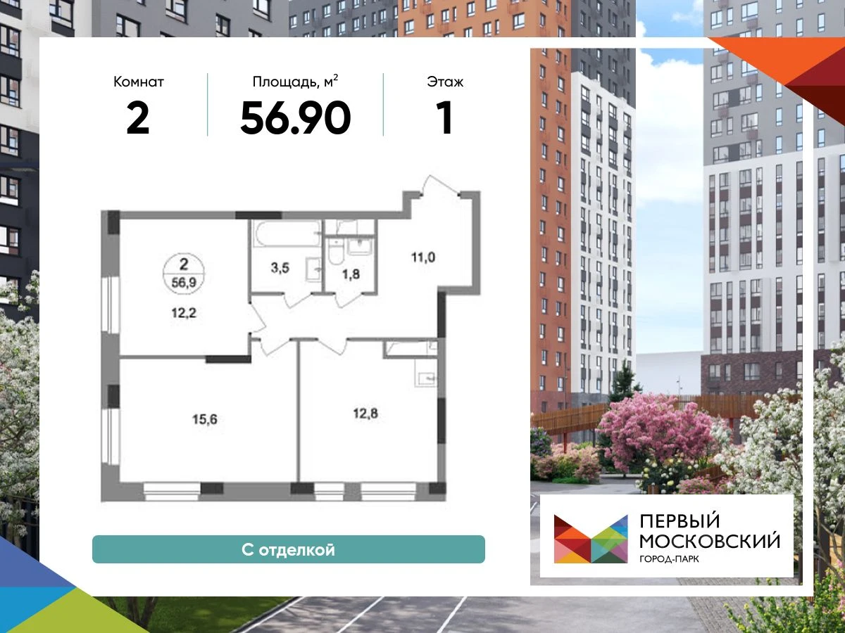 Продается 2-комнатная квартира в ЖК Город-парк Первый Московский - по цене 16 585 940 ₽ от застройщика Абсолют Недвижимость. Находится по адресу: Москва, Московский, микрорайон Первый Московский возле метро Филатов луг в районе Московский. Общая площадь квартиры - 56.9 м². Этаж 1 из 19.