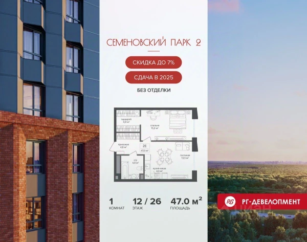 1-комнатная, 43 м², №117340