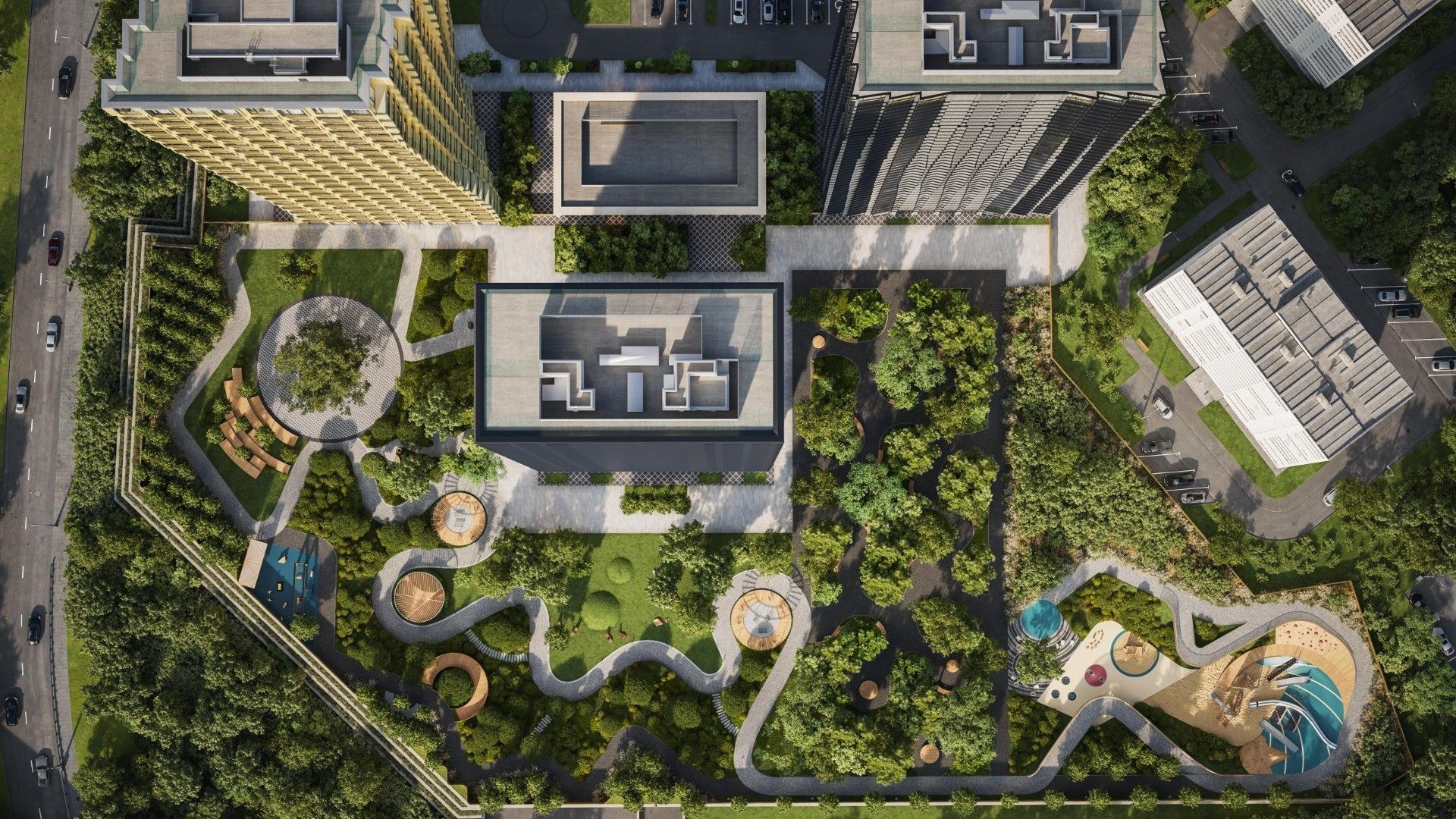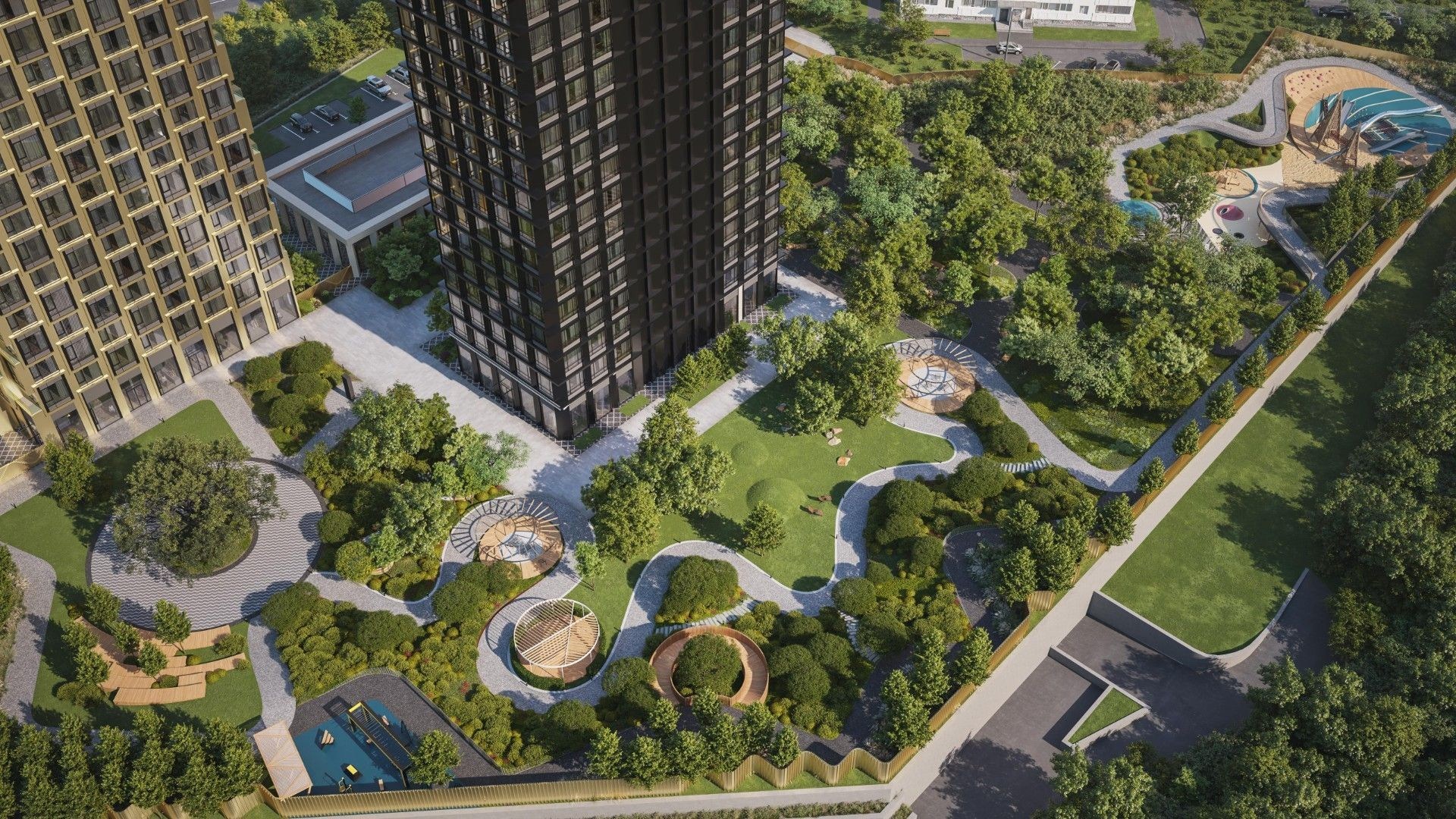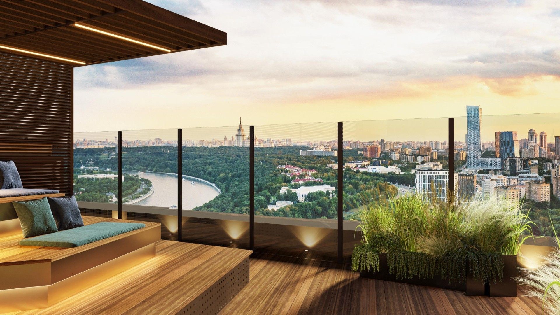На первых этажах откроются кафе, ресторан, пекарня, салон красоты, винотека, аптека, химчистка и образовательный центр. В рамках концепции Life Space предусмотрены гостевые зоны, переговорные, спа, фитнес, home office и барбекю-террасы. На крыше — панорамные смотровые площадки. Дворы закрыты, зонированы и безопасны для всех возрастов.