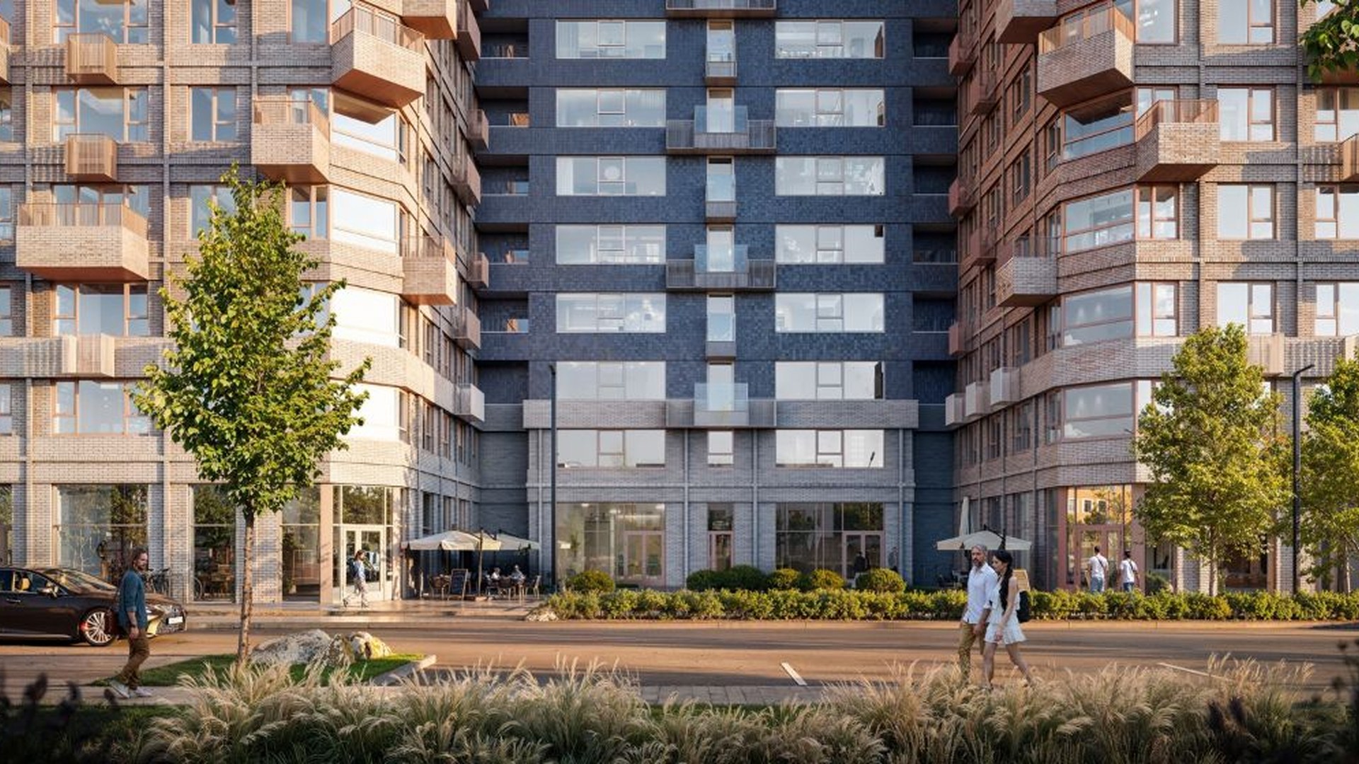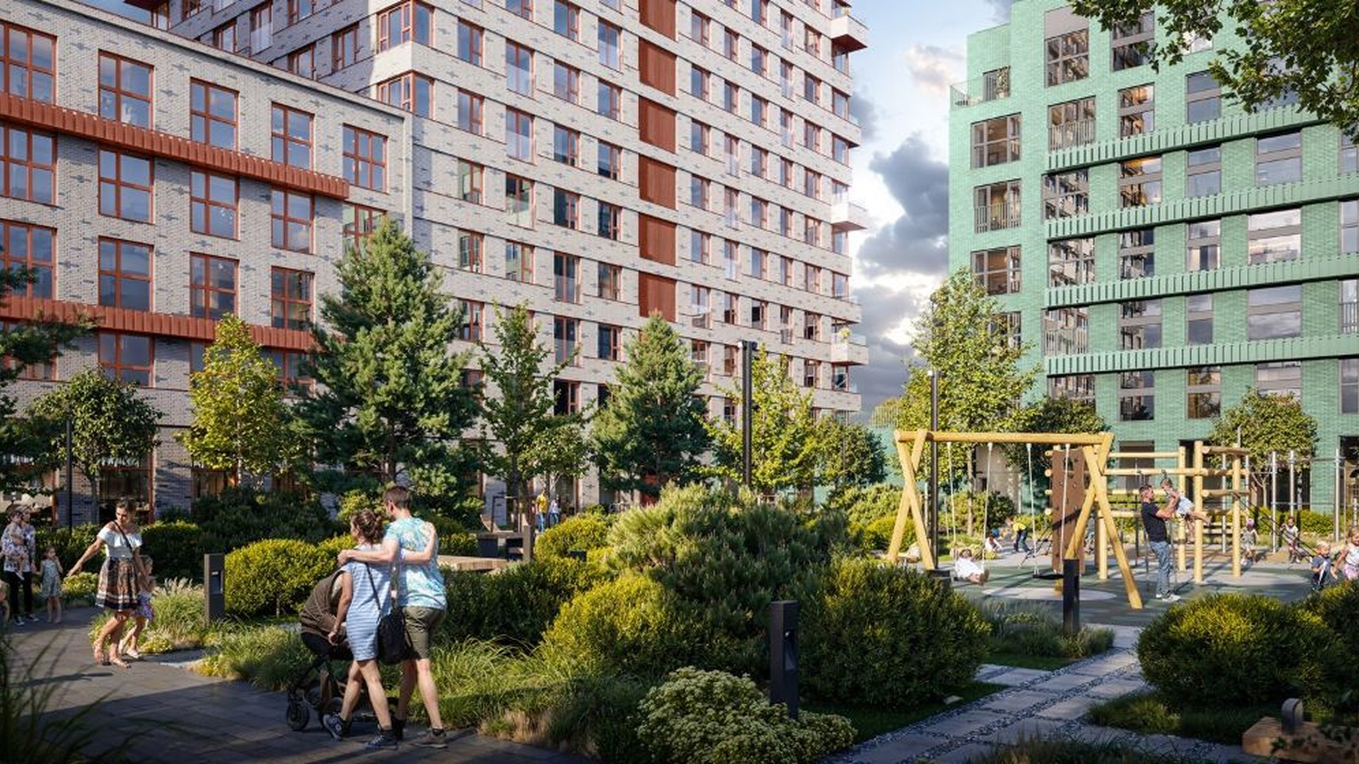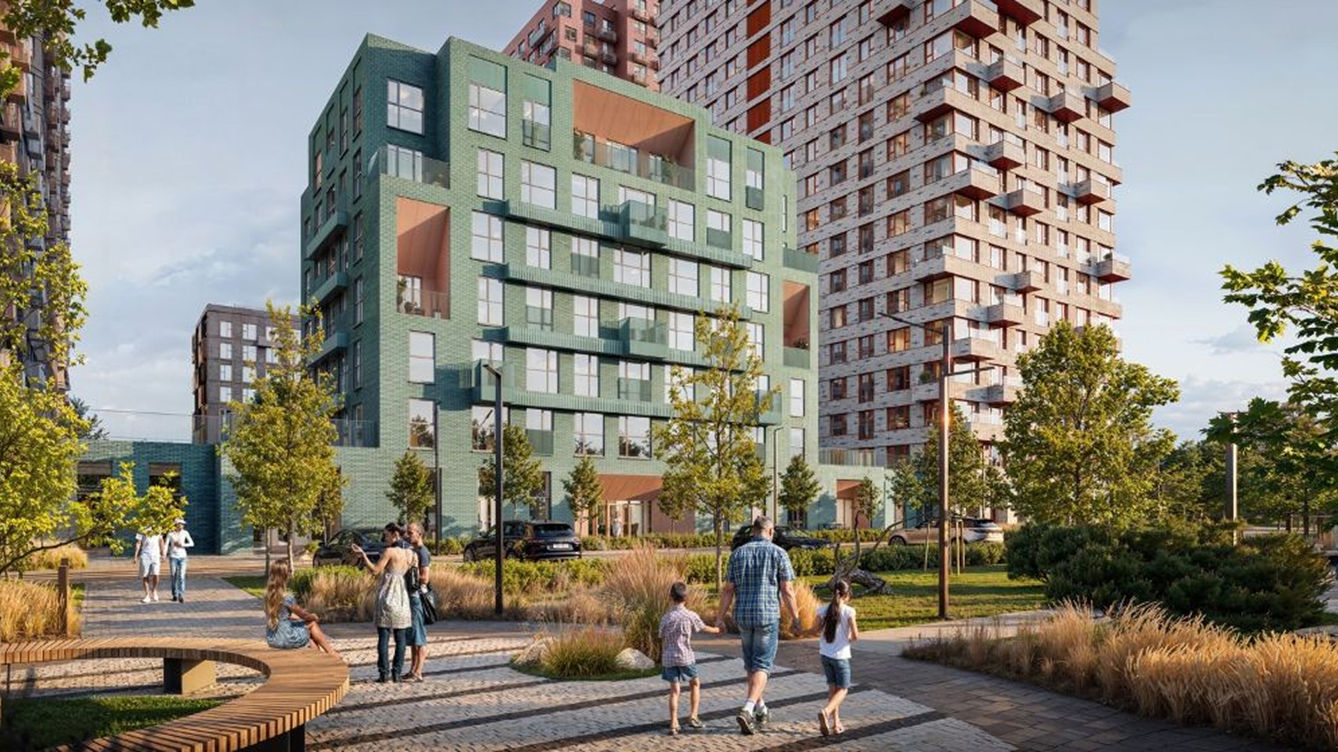 Квартал включает дома переменной этажности от 7 до 32 этажей. Доминантой ансамбля станет выразительное здание-скульптура с динамичной пластикой и цветовыми акцентами. Остальные корпуса поддерживают его образ за счёт тщательно выверенных фасадных решений. Внутренний двор закрыт от машин и посторонних, благоустроен детскими и спортивными площадками, зонами отдыха и прогулочной аллеей. Предусмотрена также «медленная зона» для электросамокатов.