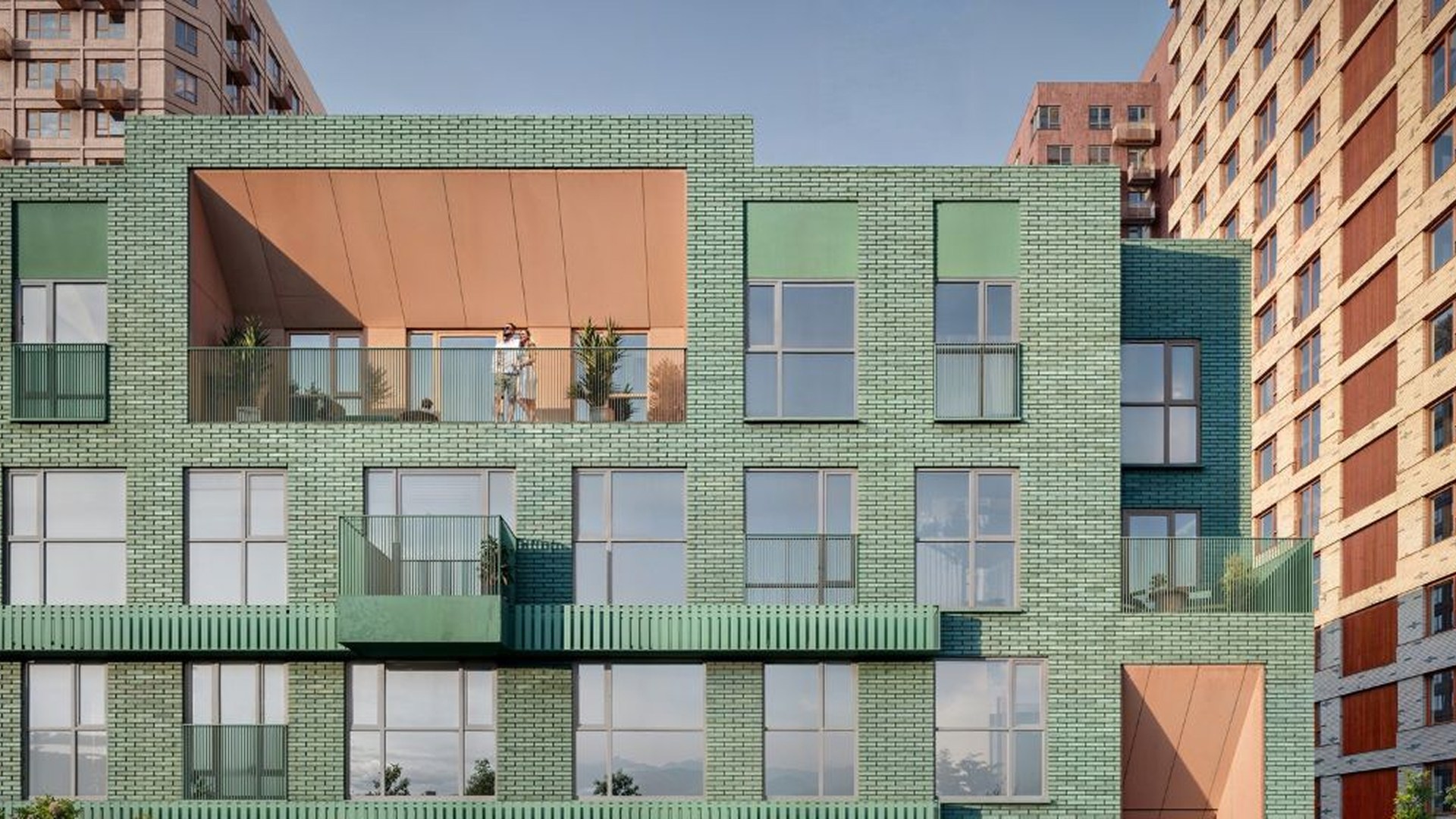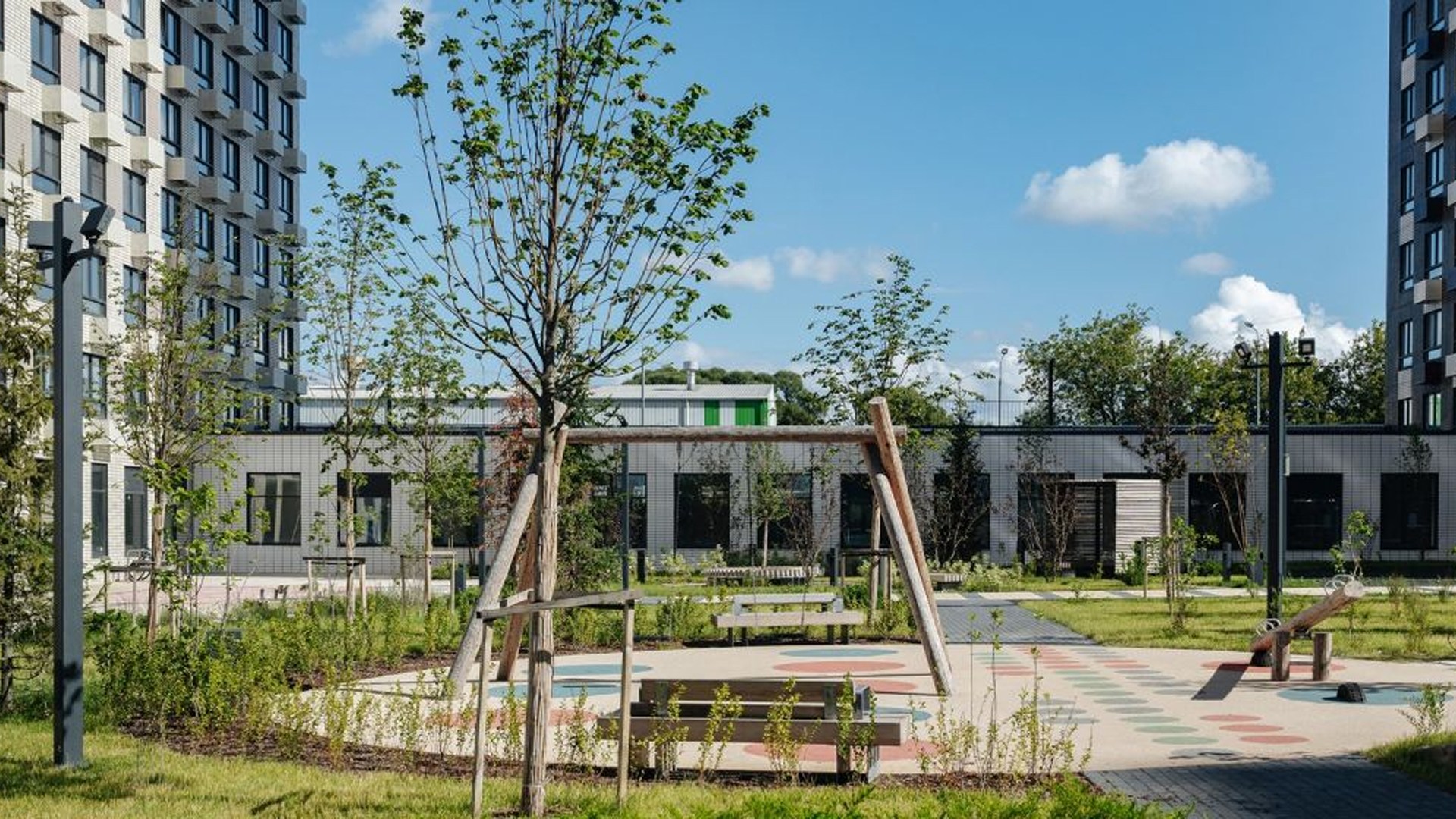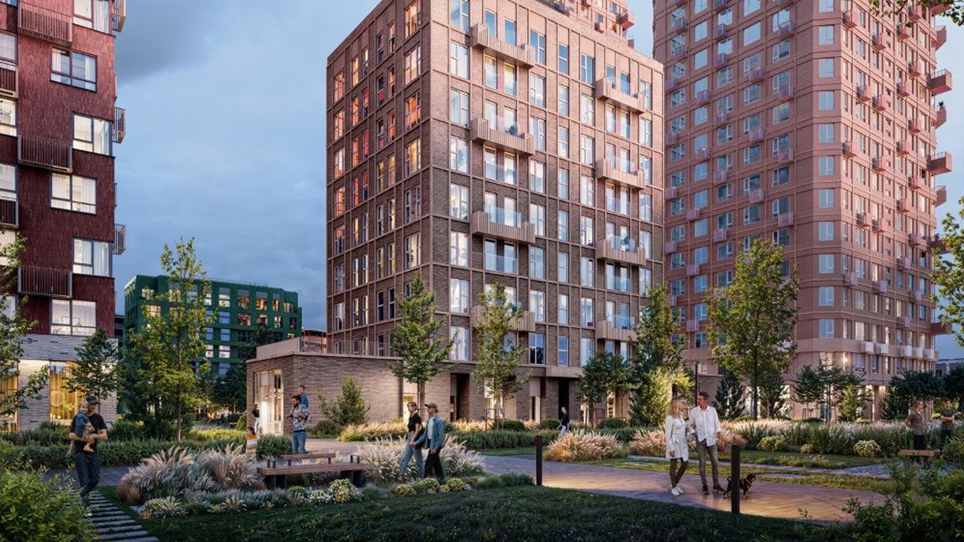 Квартал включает дома переменной этажности от 7 до 32 этажей. Доминантой ансамбля станет выразительное здание-скульптура с динамичной пластикой и цветовыми акцентами. Остальные корпуса поддерживают его образ за счёт тщательно выверенных фасадных решений. Внутренний двор закрыт от машин и посторонних, благоустроен детскими и спортивными площадками, зонами отдыха и прогулочной аллеей. Предусмотрена также «медленная зона» для электросамокатов.