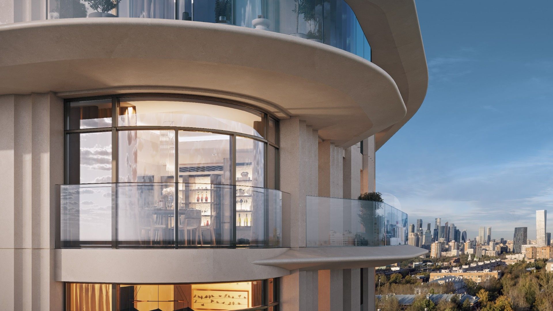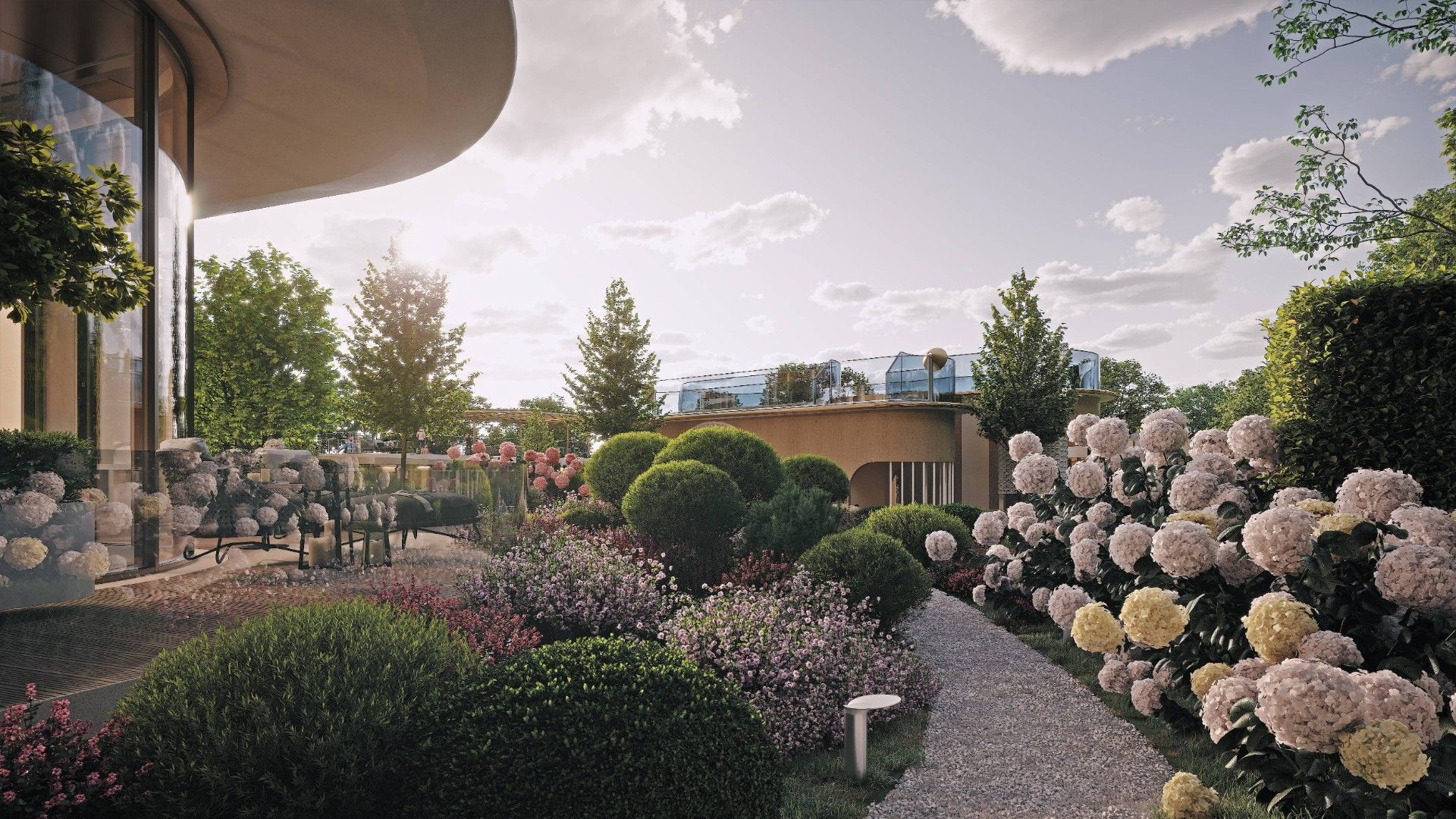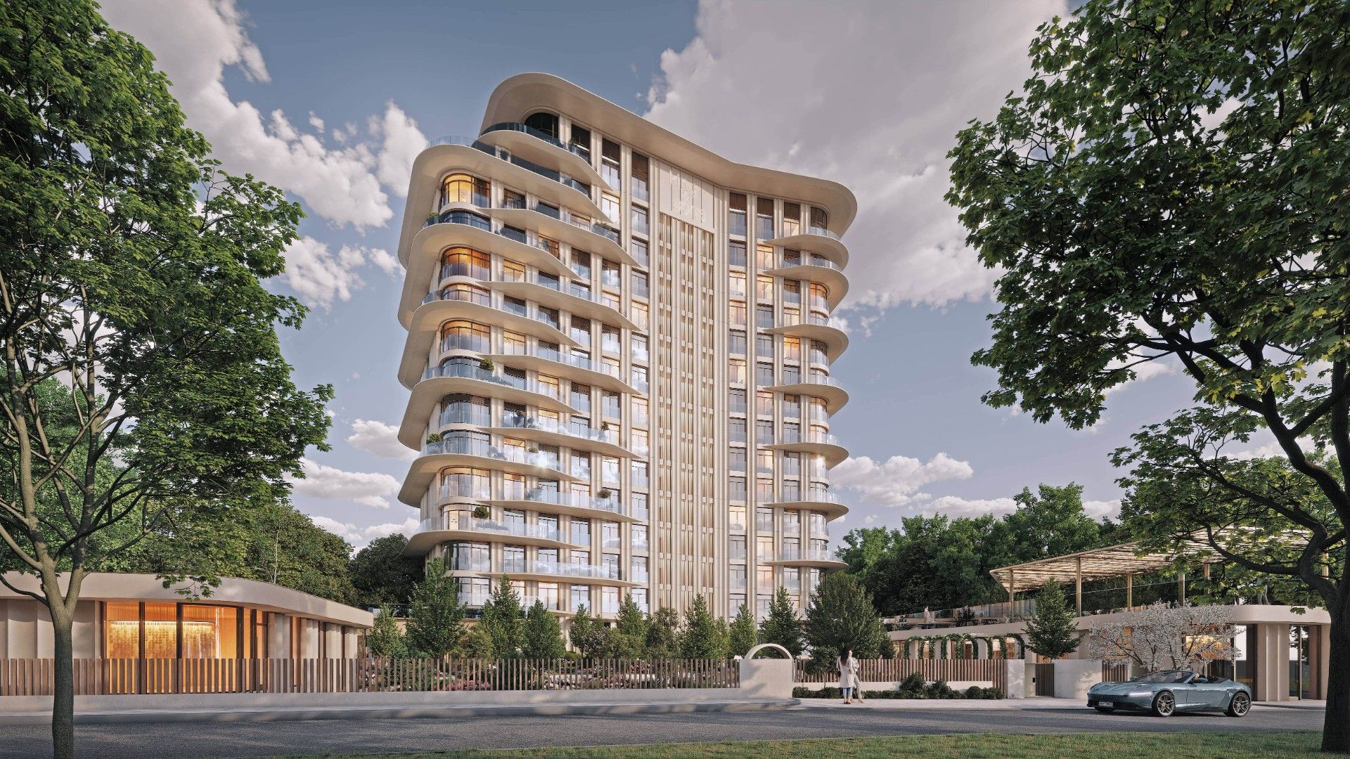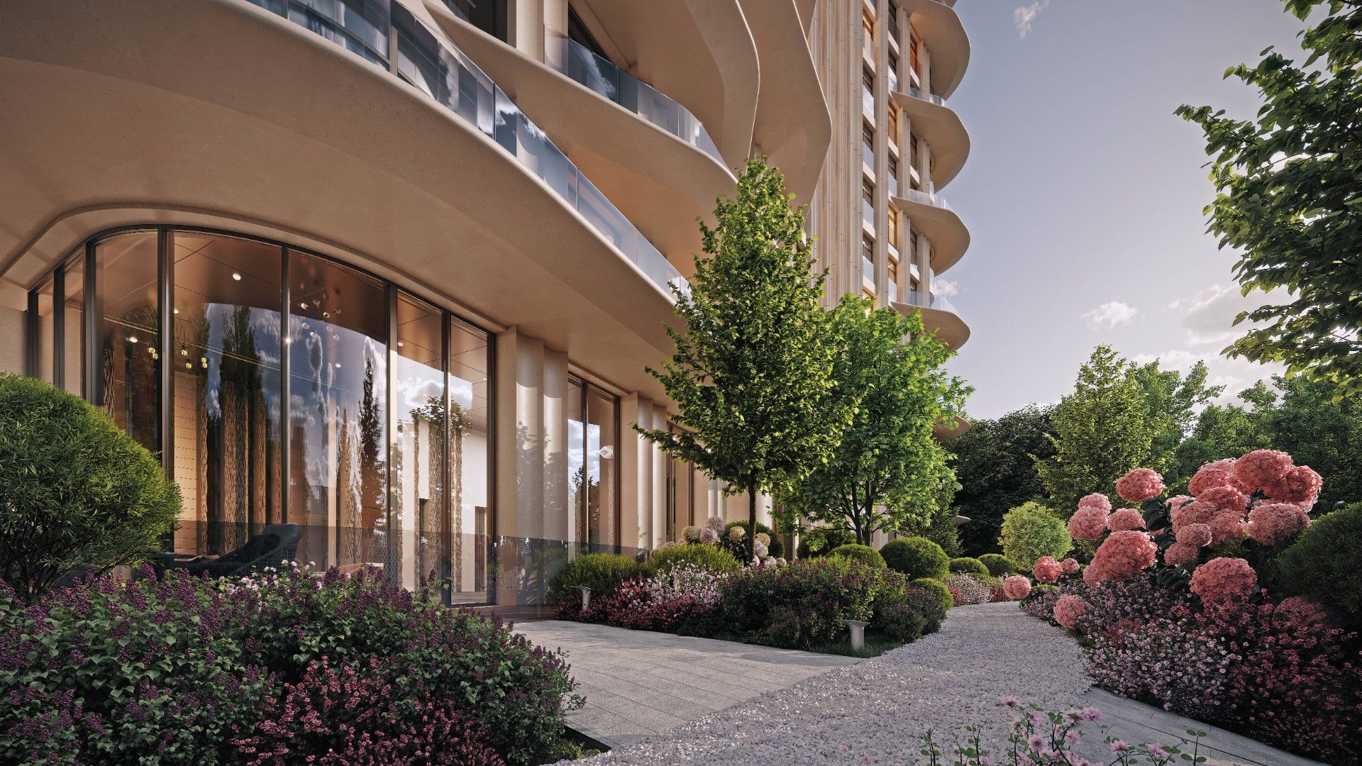 Архитектурную концепцию разработало японское бюро NIKKEN. Плавные линии фасадов, использование натурального камня и панорамное остекление формируют лёгкий, изысканный силуэт. Здание наполнено светом, воздухом и ощущением пространства.