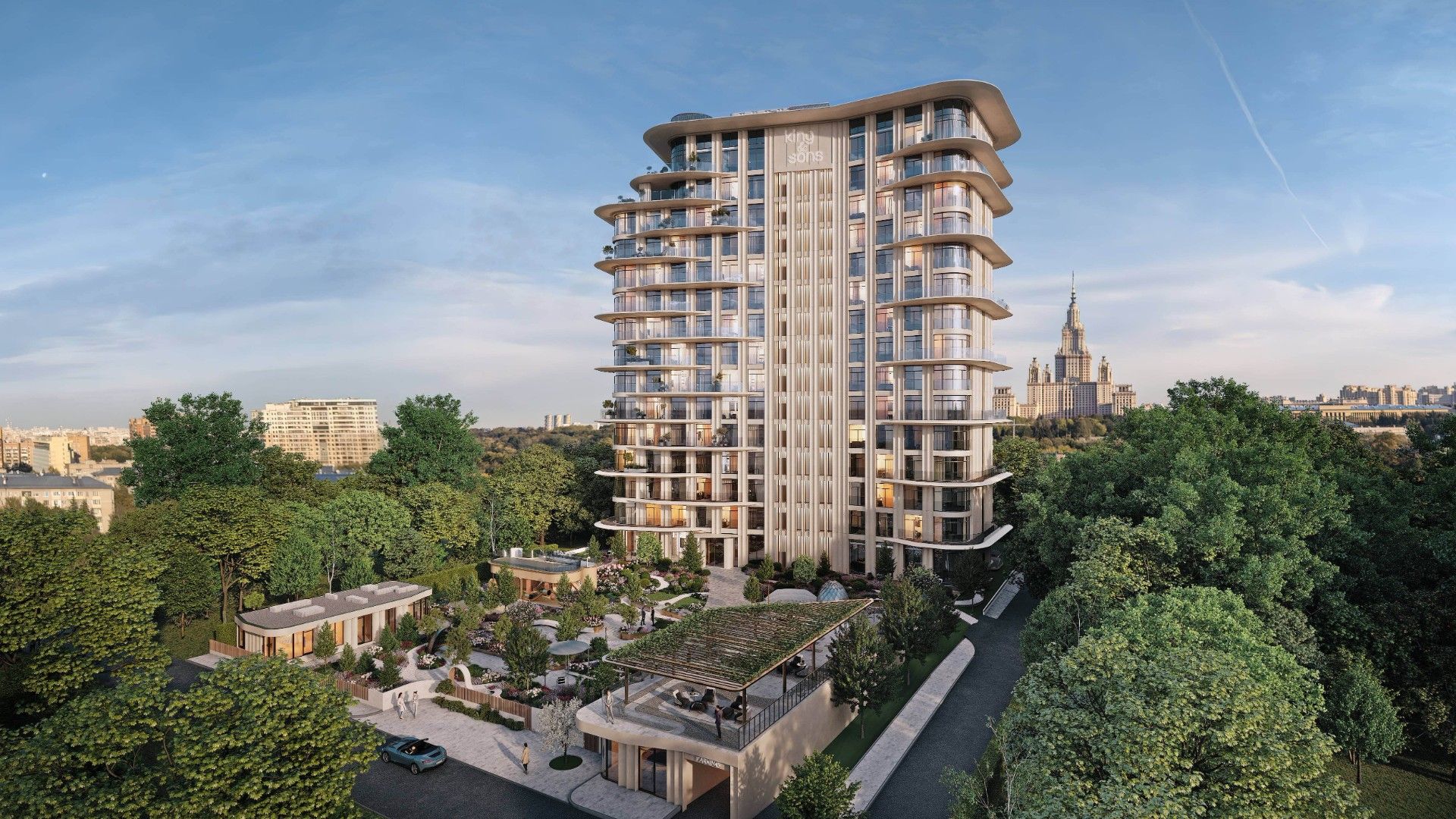 KING & SONS — камерный жилой дом клубного уровня, созданный для ценителей приватности и безупречной архитектуры. В комплексе всего 117 резиденций, включая квартиры с просторными террасами, апартаменты с личными патио и несколько пентхаусов с панорамными видами на главное здание МГУ. Отсутствие коммерческих помещений обеспечивает атмосферу уединения и тишины.