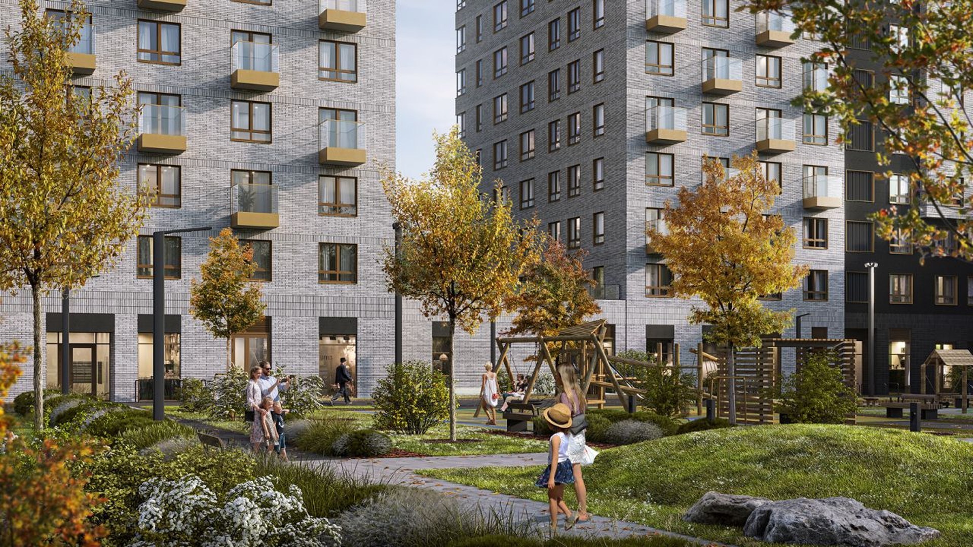 Дворы освобождены от машин и оформлены как ландшафтные парки с детскими площадками и зонами отдыха. Спортивные площадки расположены за пределами дворов, чтобы сохранять тишину у жилых корпусов.
