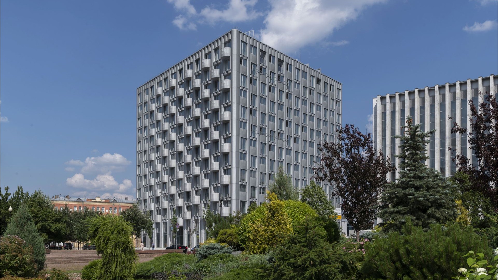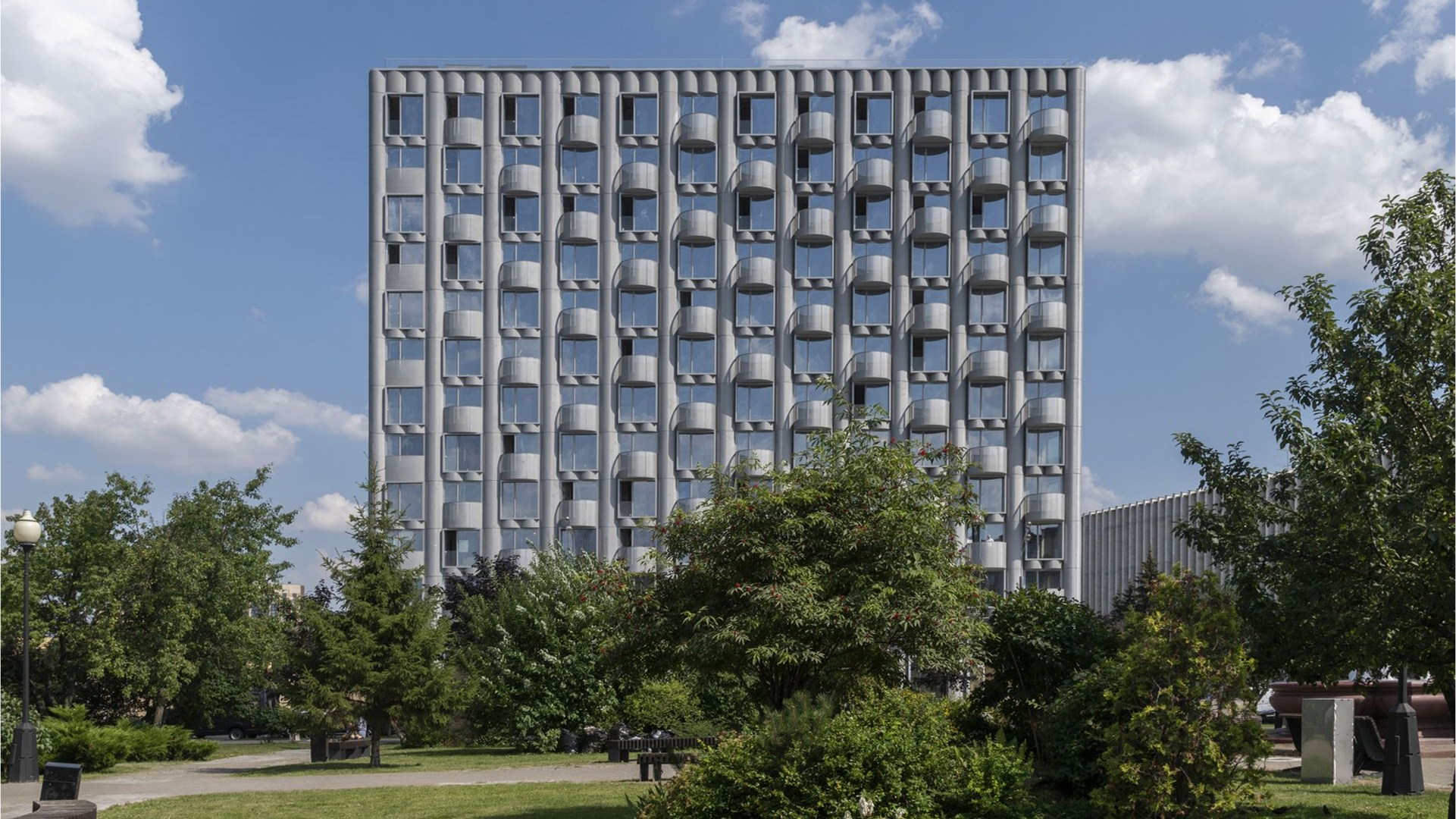 Жилой дом Logos — это архитектурный образ, в котором фундаментальность сочетается с лёгкостью, а инженерная точность — с визуальной поэзией. Его фасады обтянуты воздушной металлической сеткой, создающей эффект парящей структуры. Этот приём делает облик здания одновременно выразительным и сдержанным — оно привлекает внимание, но не конфликтует с городской средой, а становится её частью.
