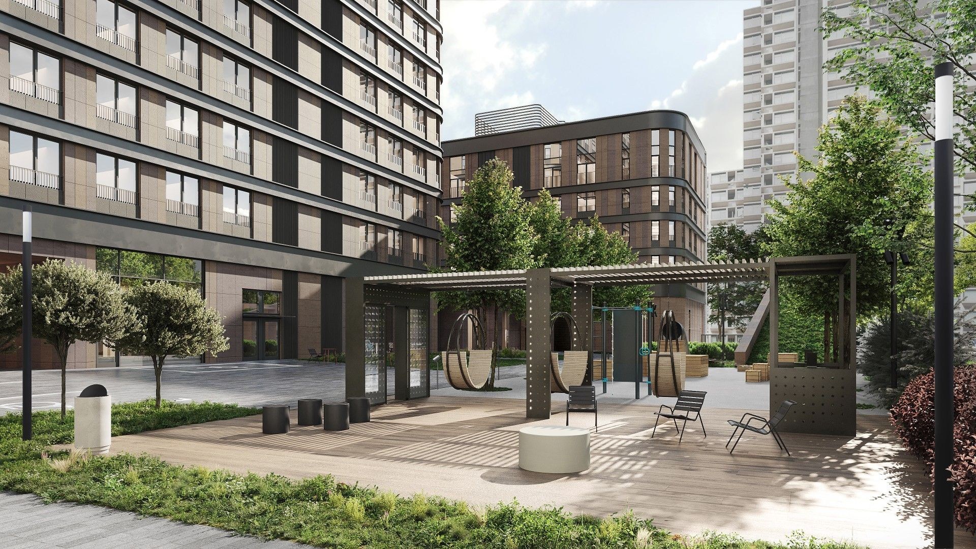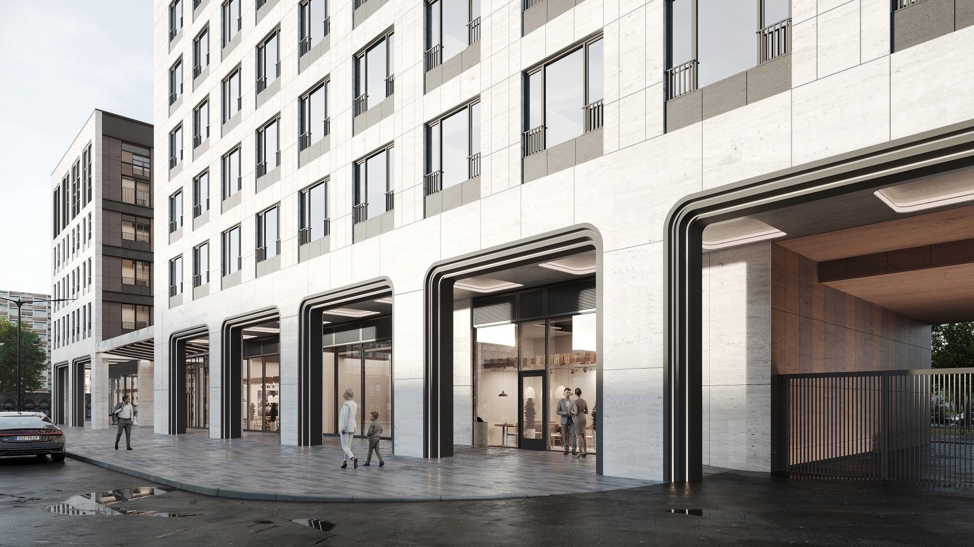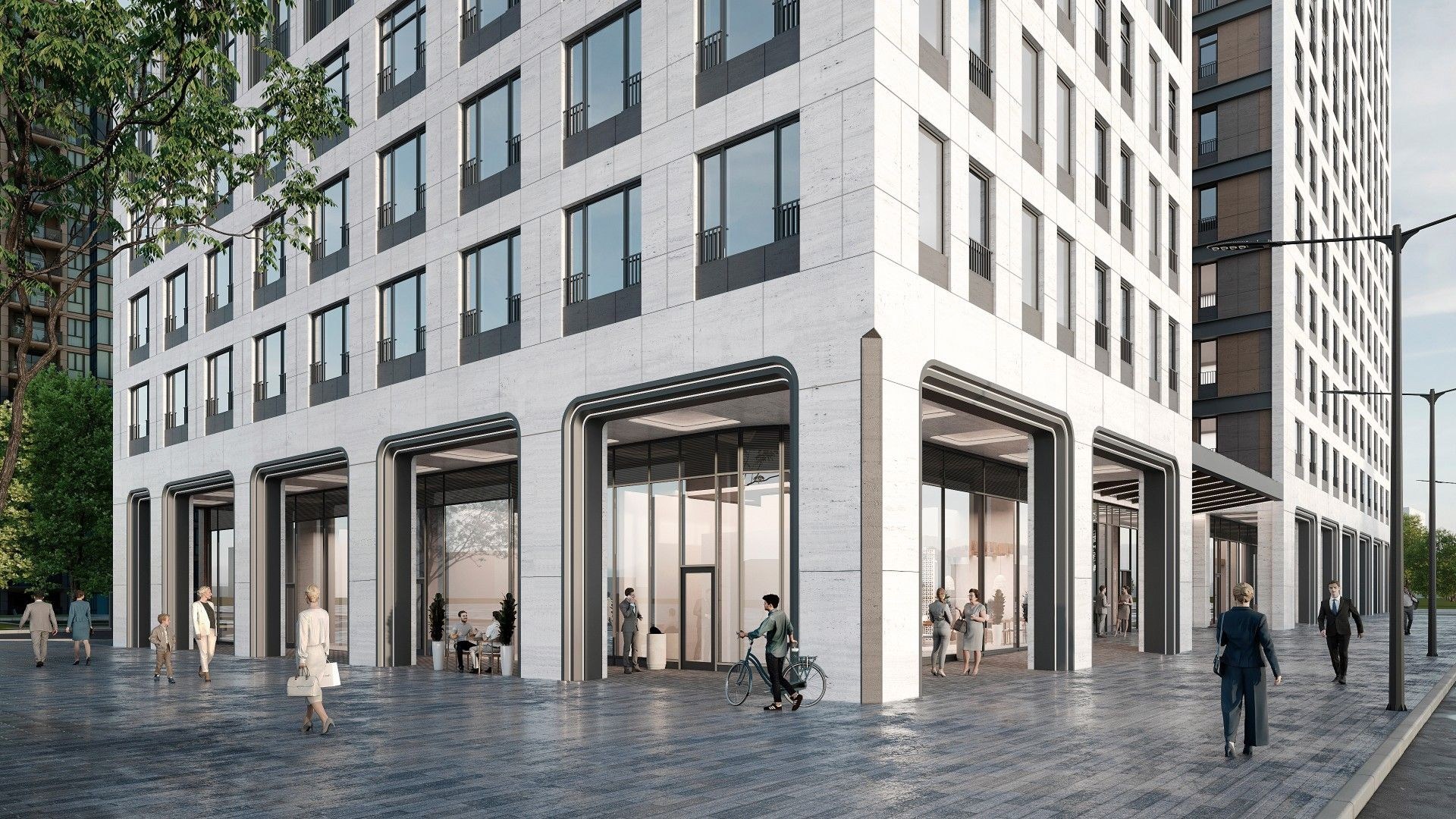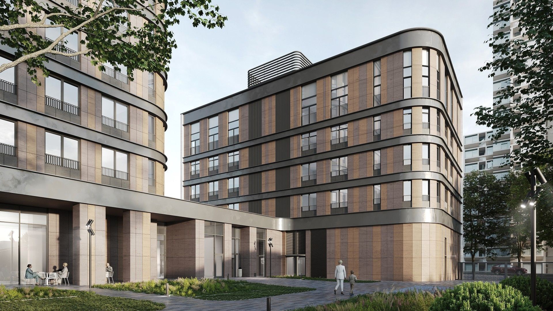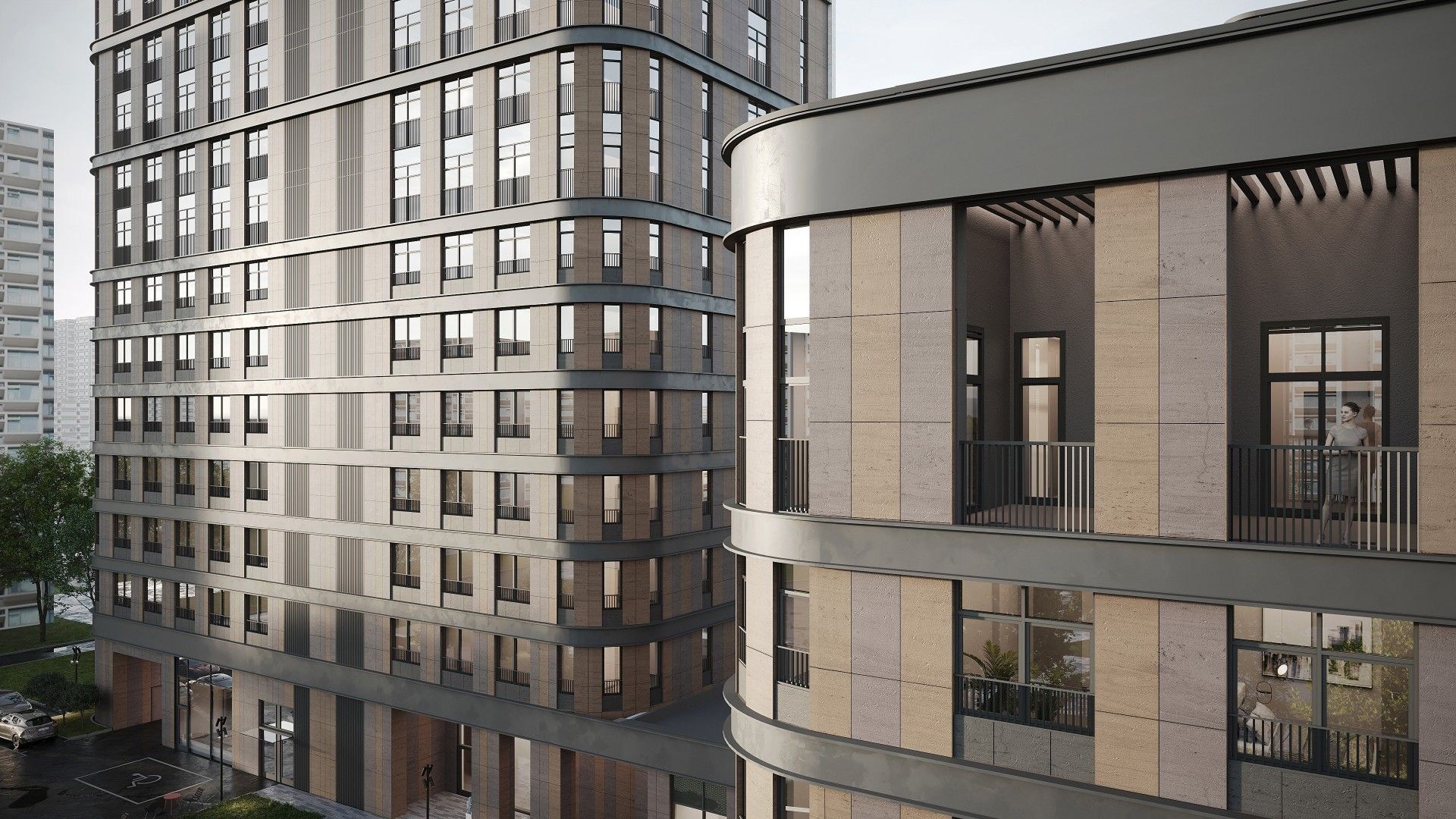 Архитектурная концепция выполнена в стиле модернизм с акцентом на элегантность и пластичность форм. Белоснежный керамогранит, арочные элементы и переменная этажность придают фасадам лёгкость и выразительность. Внутренние фасады оформлены панелями в тёплой гамме коричневых оттенков. Дополняет облик — архитектурная подсветка: акценты на фасадах со стороны улицы и деликатная функциональная подсветка внутренних пространств, включая входные группы и проезды.