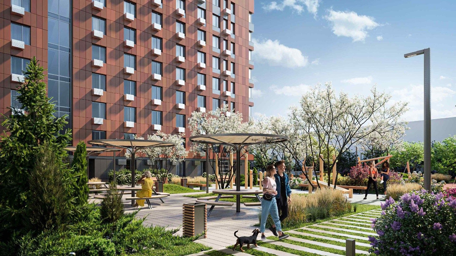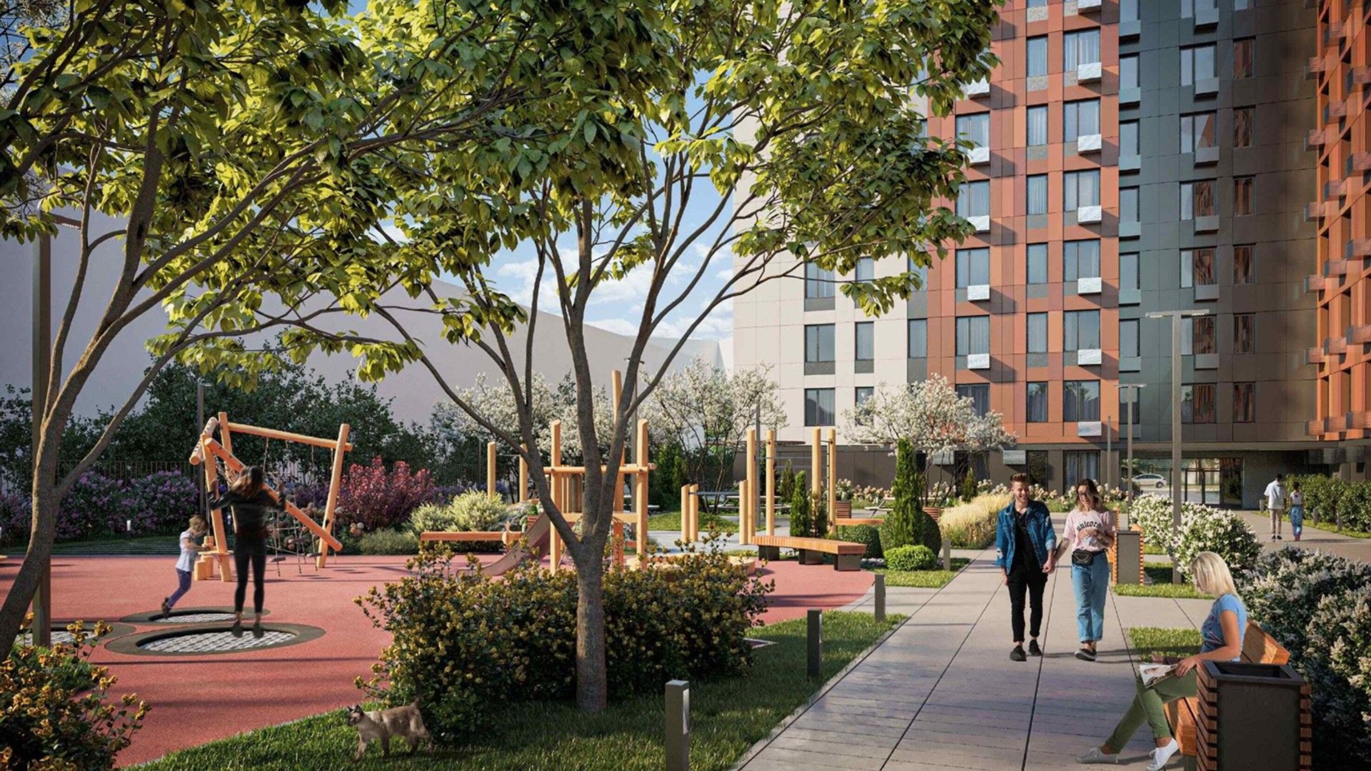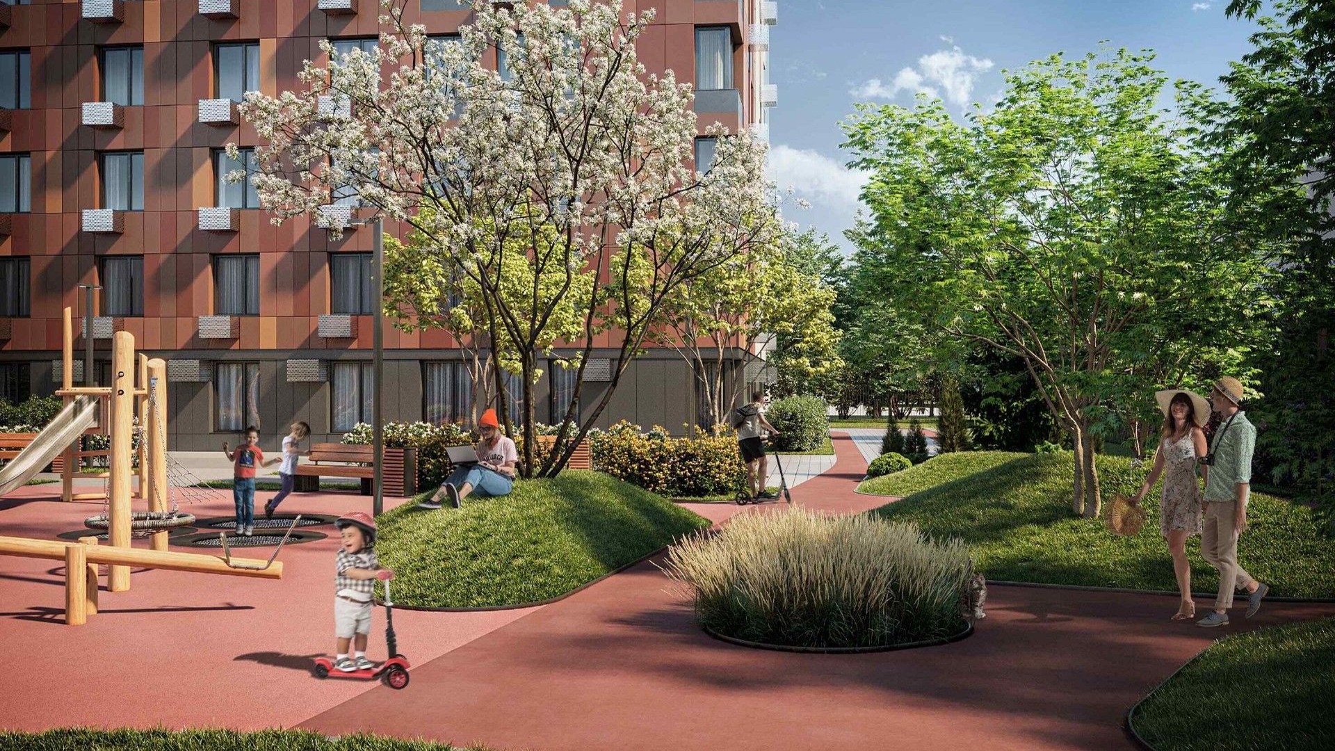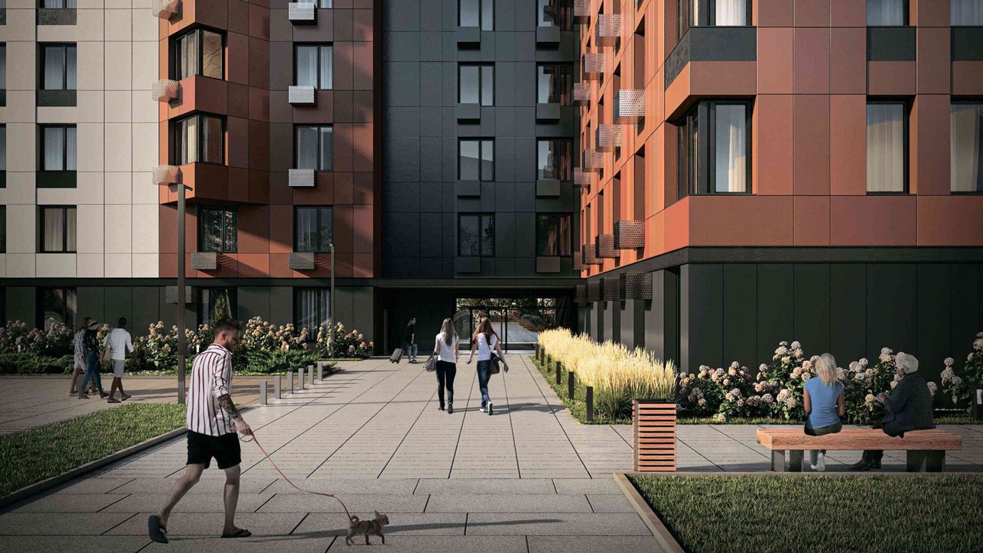 На первых этажах зданий предусмотрены кафе, продуктовые магазины, аптеки и сервисные предприятия, что позволяет жителям решать повседневные задачи, не покидая пределы комплекса. Внутренняя территория огорожена и благоустроена: реализована концепция «двор без машин», предусмотрены ландшафтное озеленение, современные детские и спортивные площадки, малые архитектурные формы, система видеонаблюдения и охраны 24/7.