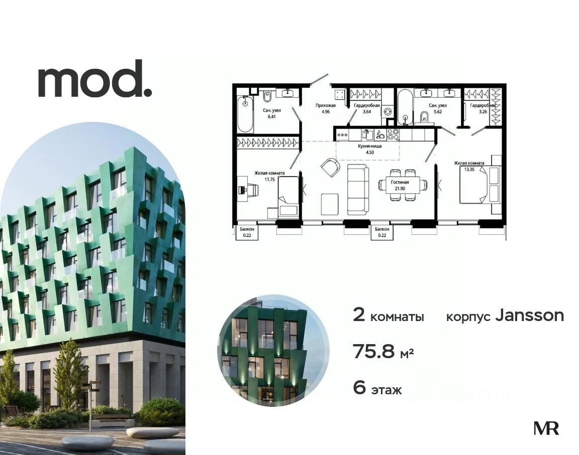 Продается 2-комнатная квартира в ЖК Mod (Мод) - по цене 46 589 952 ₽ от застройщика Трансстройинвест. Находится по адресу: Москва, 4-я улица Марьиной Рощи возле метро Марьина Роща в районе Марьина роща. Общая площадь квартиры - 75.83 м². Этаж 6 из 7.