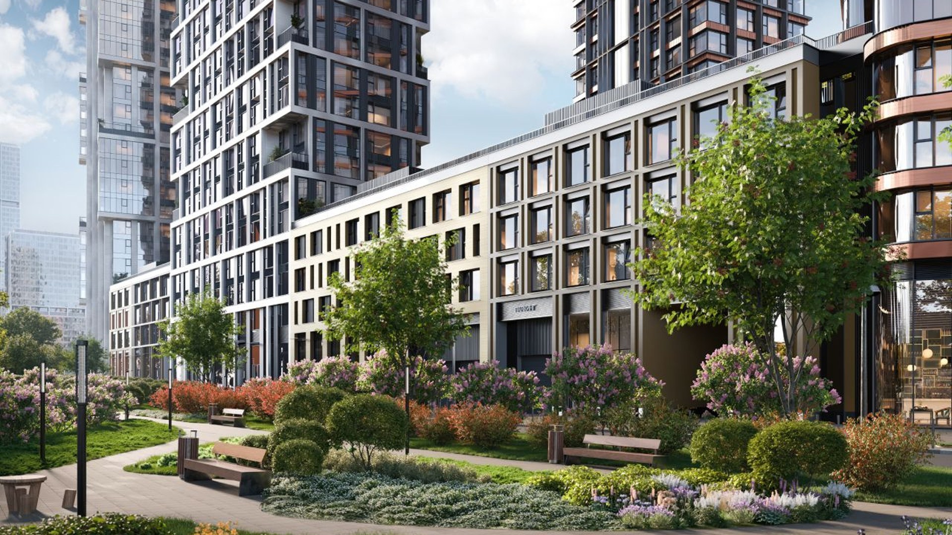 На первых этажах разместятся магазины, кафе, фитнес-клубы, салоны и супермаркеты. Коммерция ориентирована на внешний периметр квартала. Запланированы школа и поликлиника. В комплексе — подземный паркинг на 594 машины.