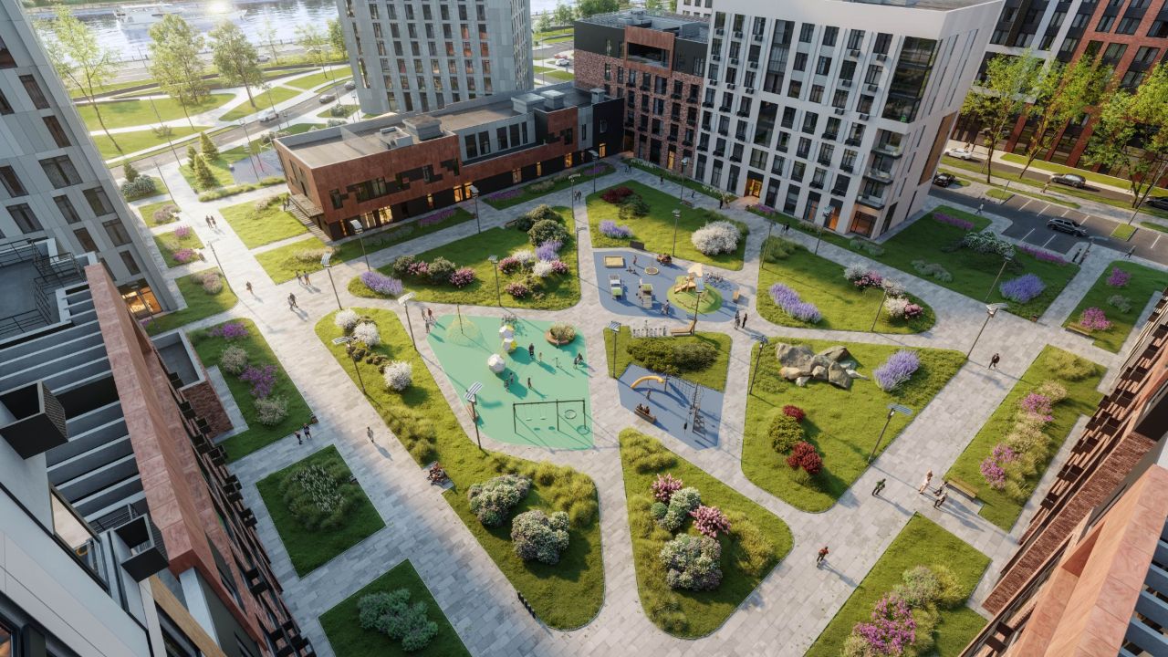 Архитектурную концепцию разработало британское бюро AHR. Визуальное решение строится на минималистичной эстетике, чёткой геометрии фасадов и французских окнах. Площадь закрытой территории составляет 15 гектаров, из которых 2,5 гектара занимает ландшафтный парк с аллеями, скамейками, беседками и зонами отдыха. В каждом дворе обустроены тематические пространства с детскими площадками, спортивными зонами и зелёными аллеями.