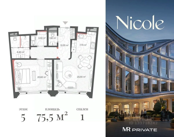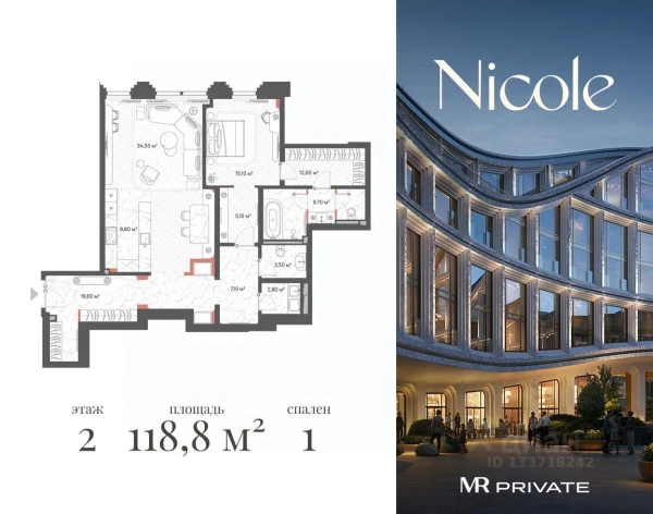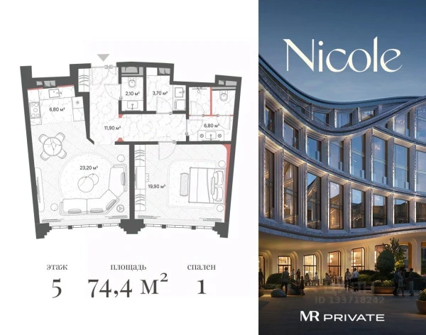 Однокомнатная квартира ЖК «Nicole» · 69.9 м²