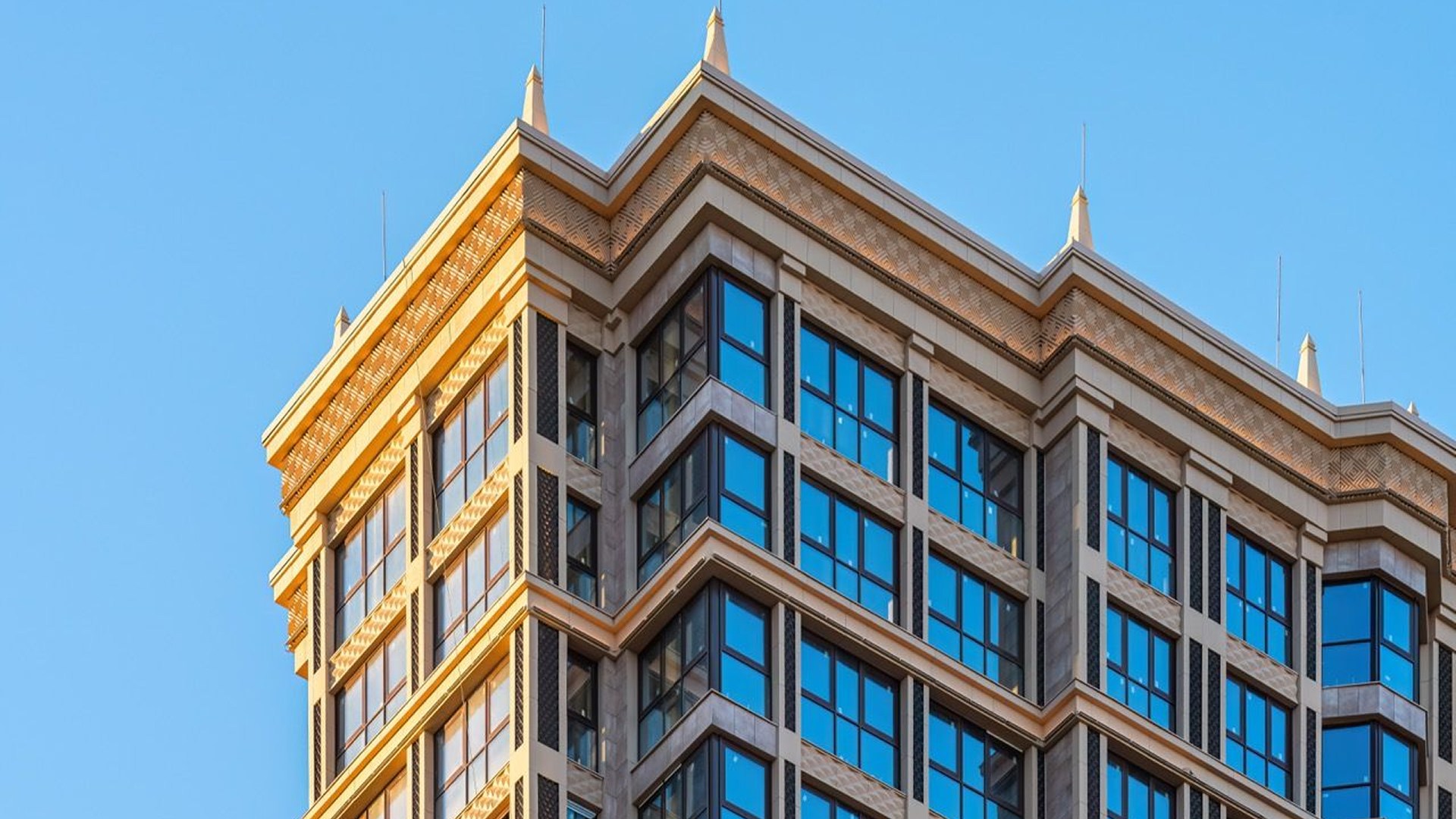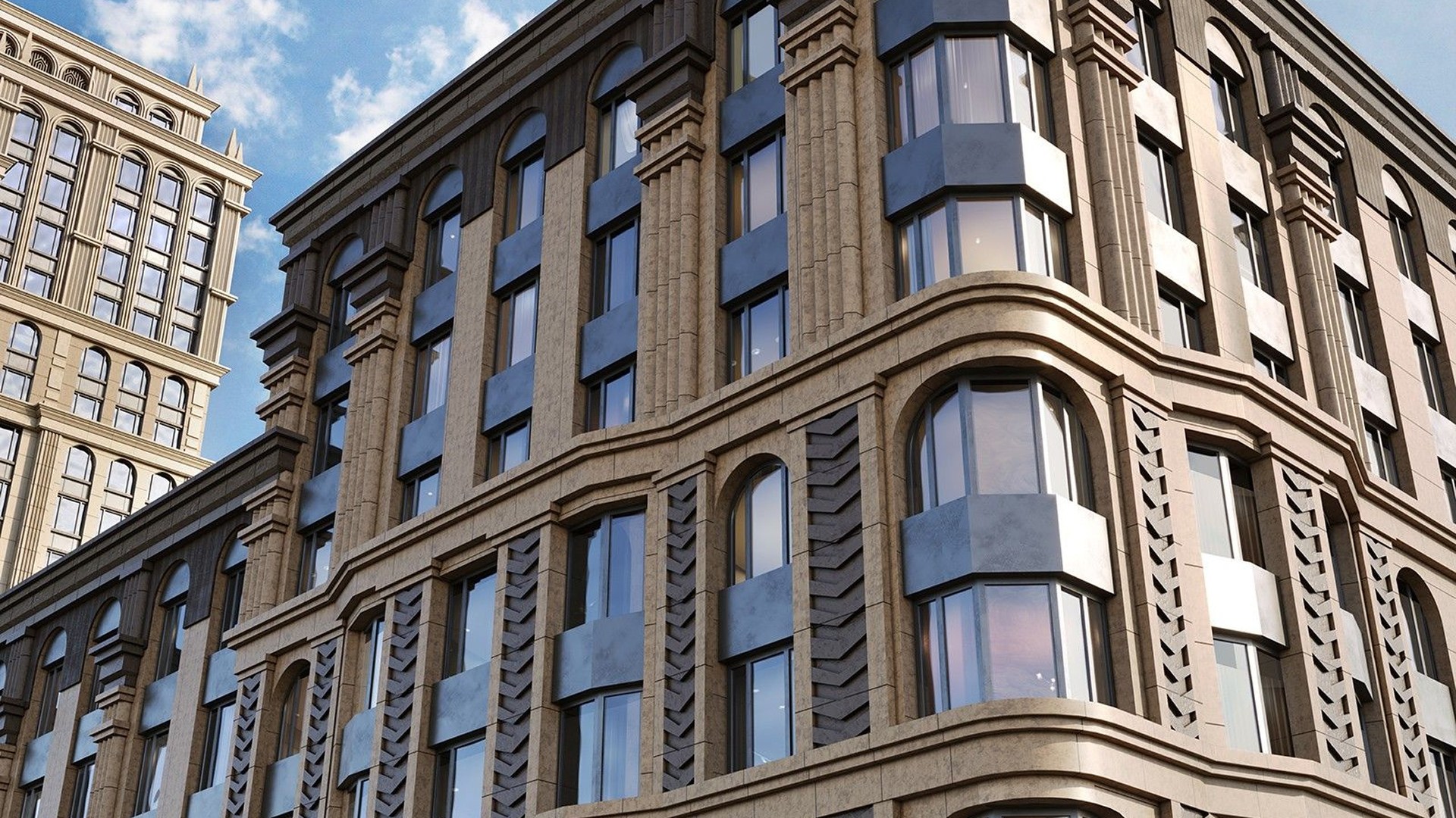 Проект выполнен в стиле Москвы 30–40-х годов. Все дома отличаются оригинальной формой и выразительными фасадами с объёмным декором и панорамным остеклением. Строительство ведётся по монолитной технологии с применением современных и экологичных материалов. Входные группы украшены мрамором, лепниной, высокими потолками и стойками ресепшн — всё это продолжает архитектурную идею и подчёркивает статус комплекса.