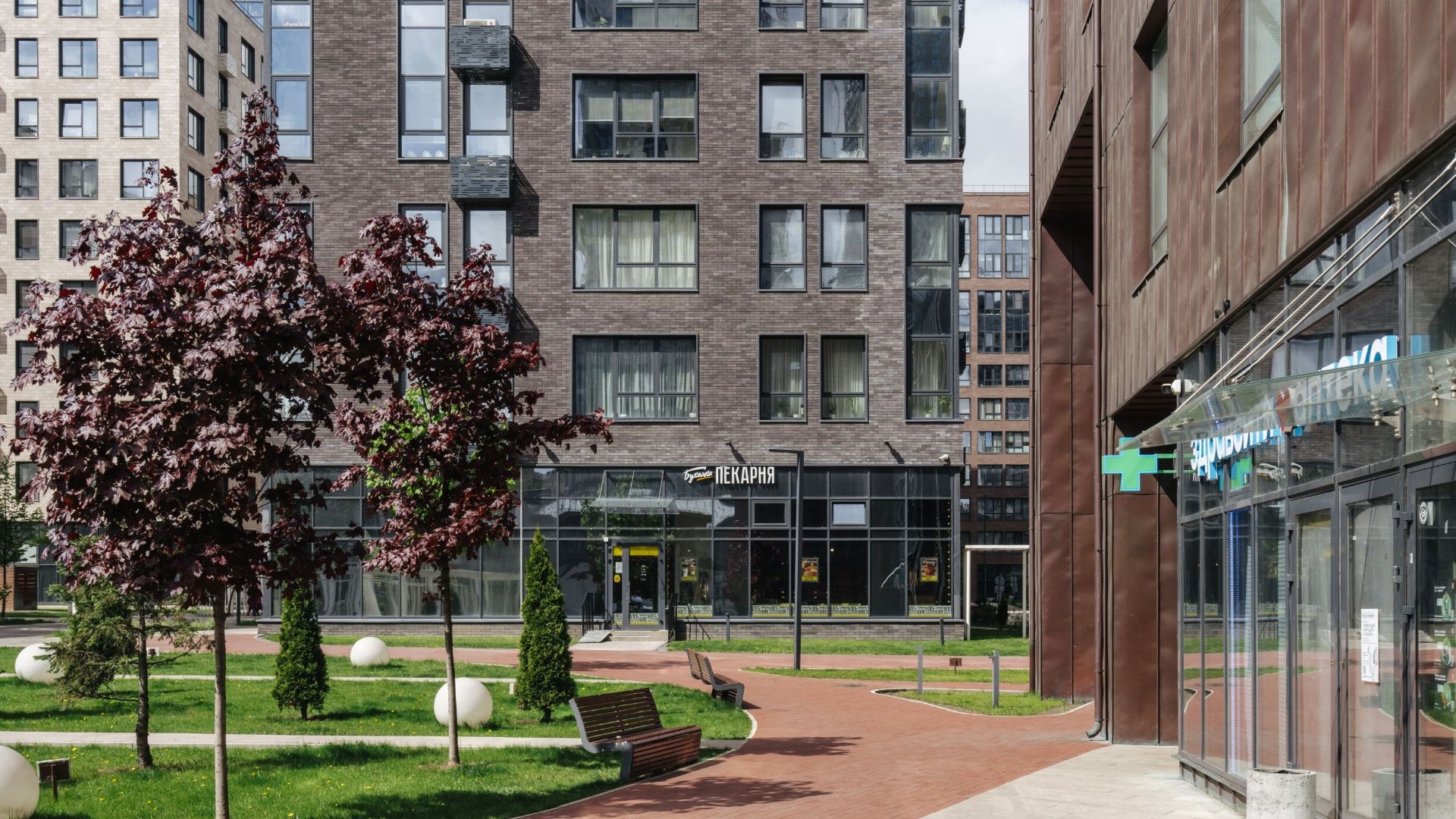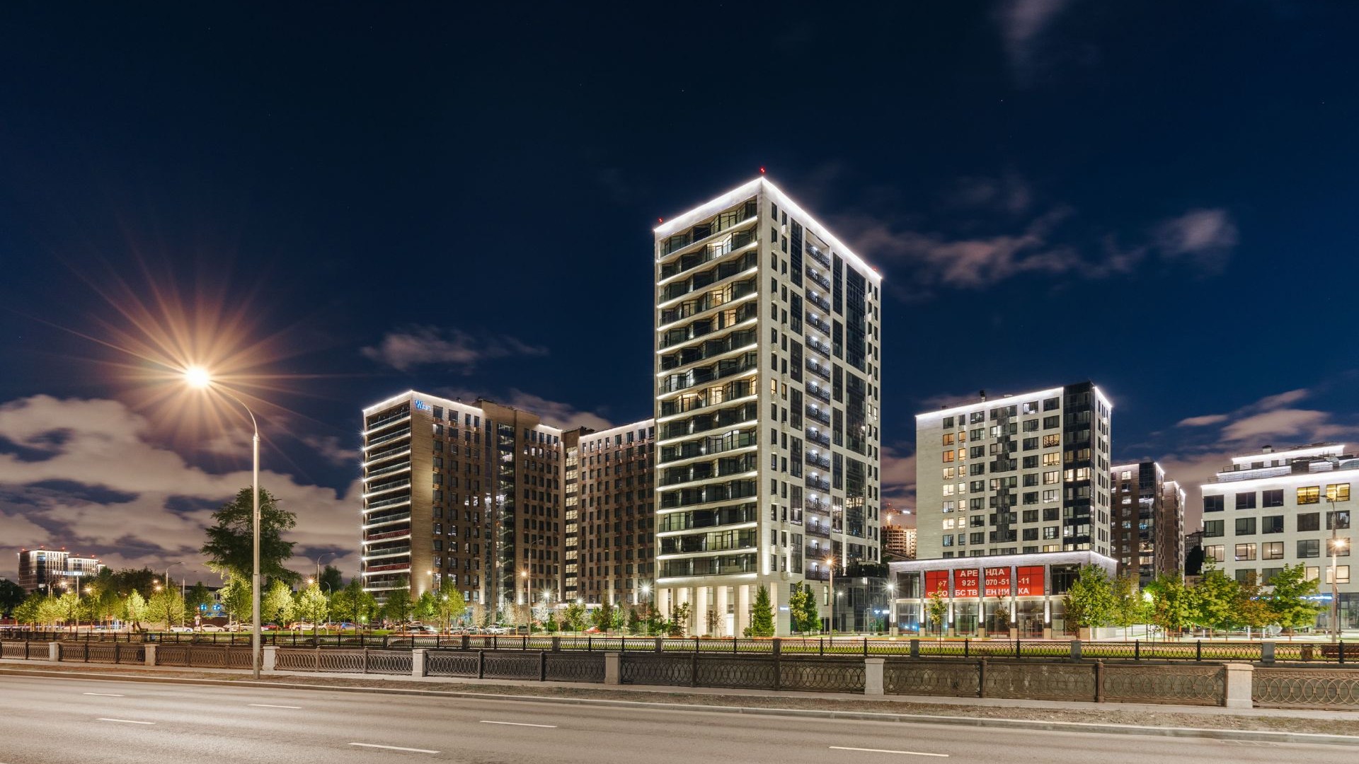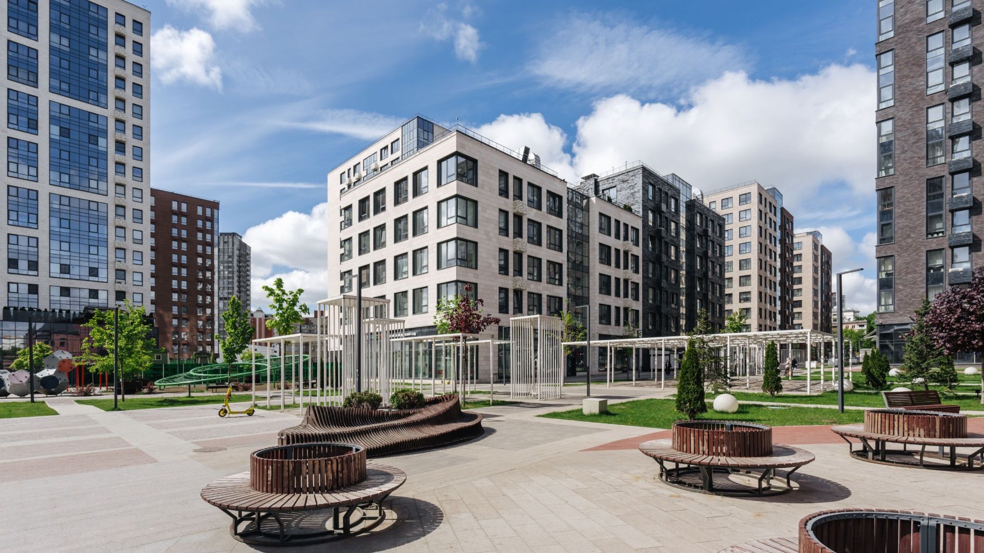 Фасады зданий оформлены натуральным камнем и панорамным остеклением, которое подчеркивает масштаб и динамику проекта. Дома переменной этажности образуют уютные закрытые дворы, обрамлённые зелёными зонами и сквером. Центральная ось квартала — просторный бульвар, который ведёт к площади с общественными и торговыми функциями.