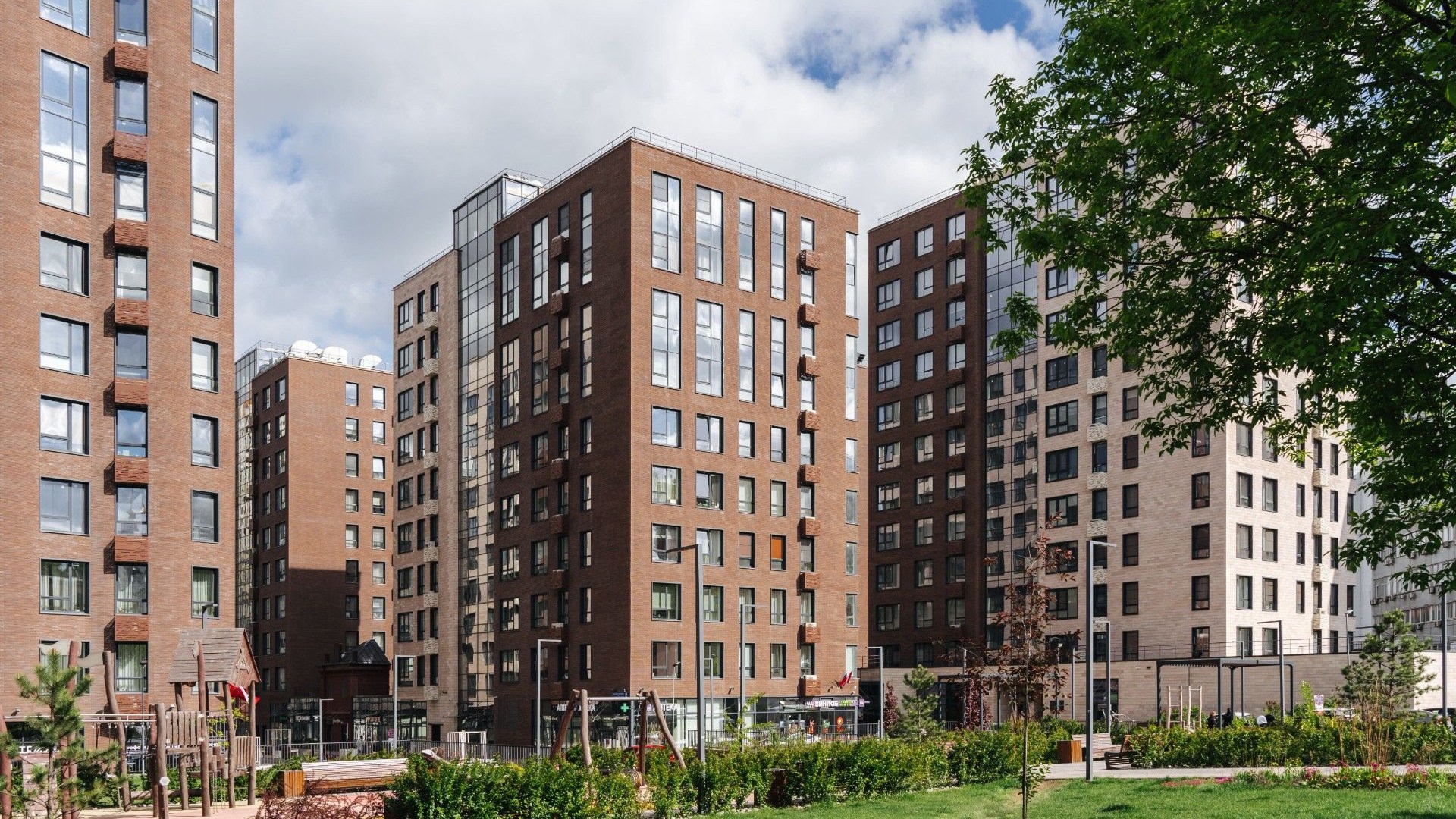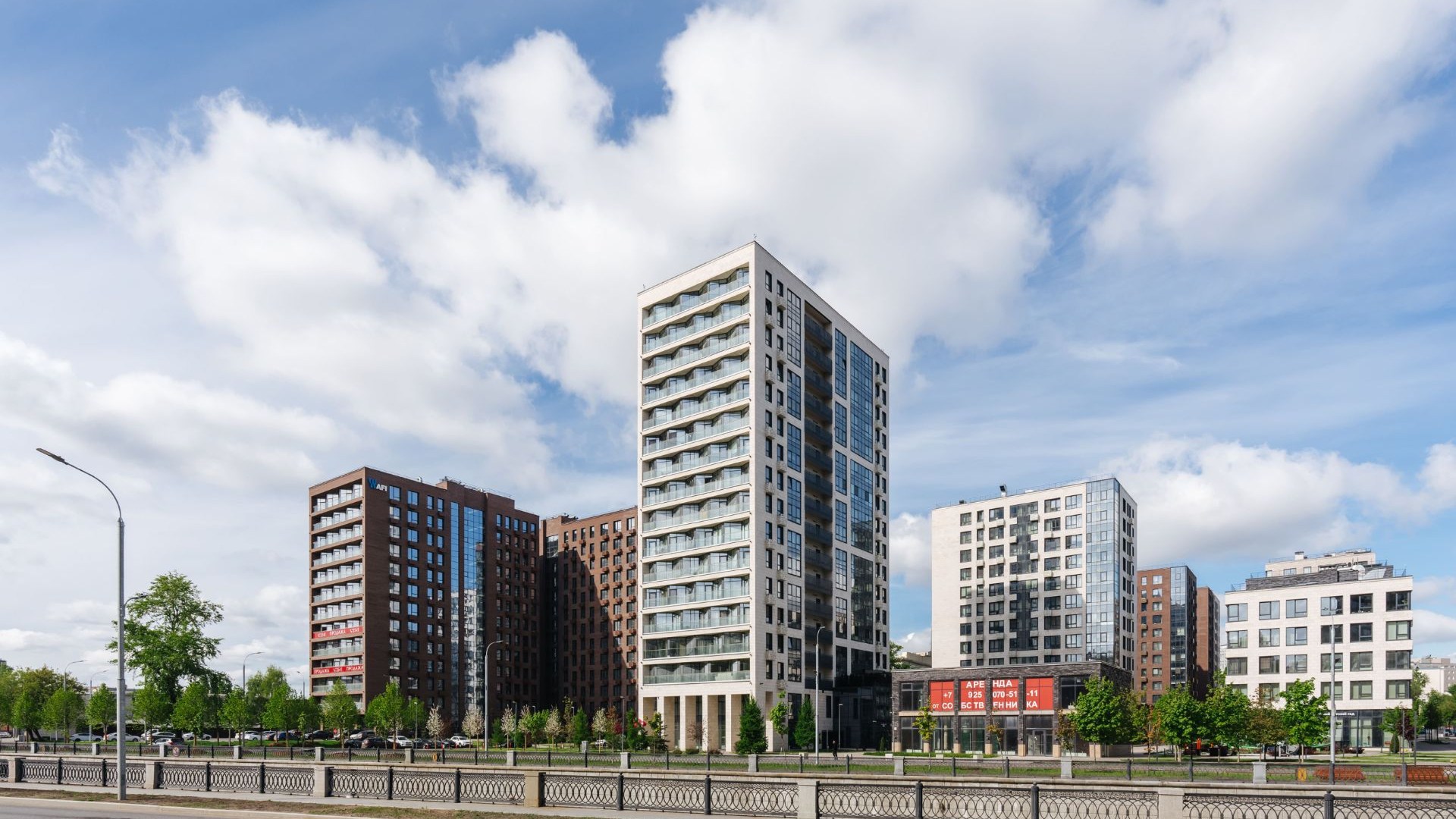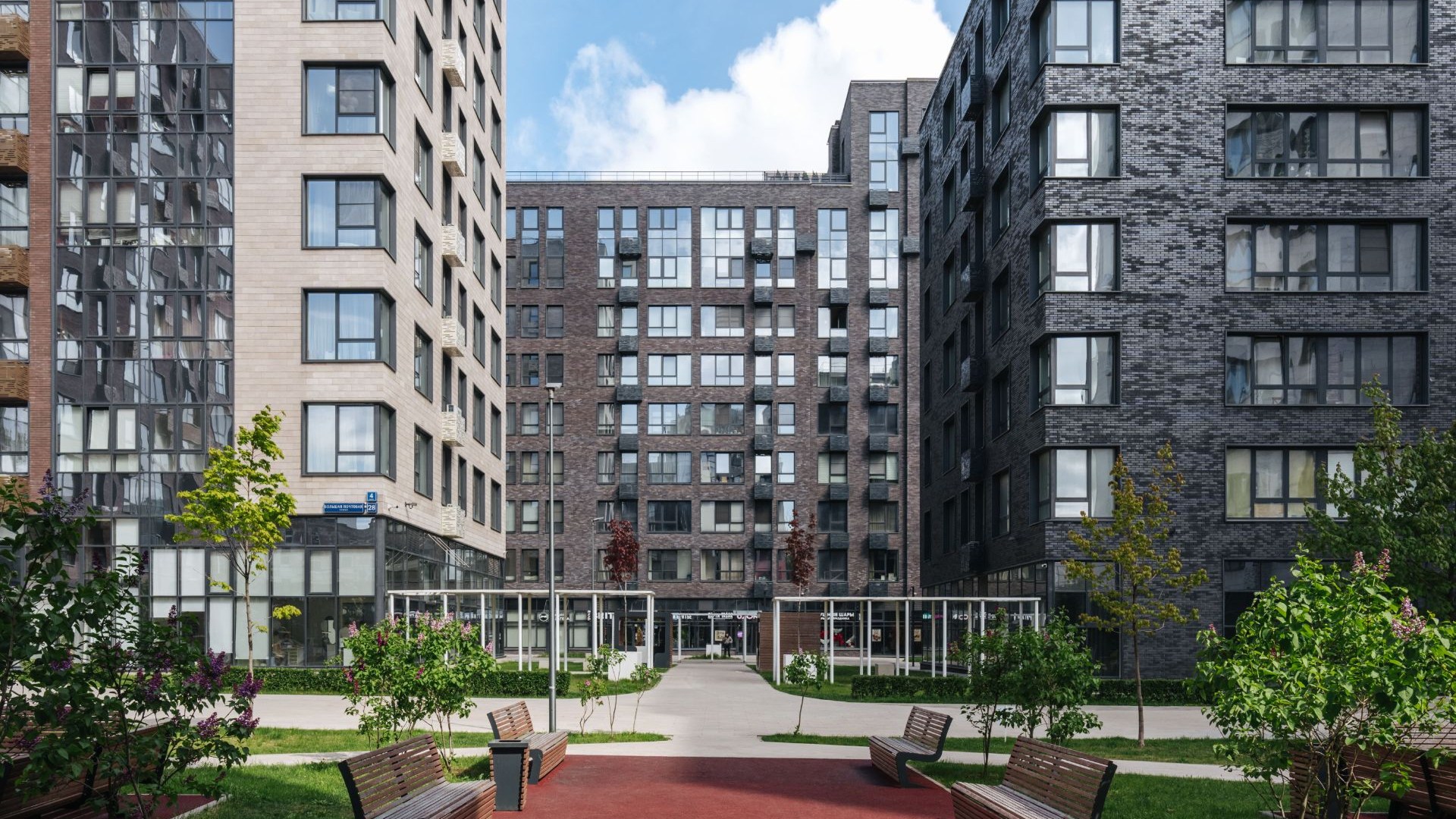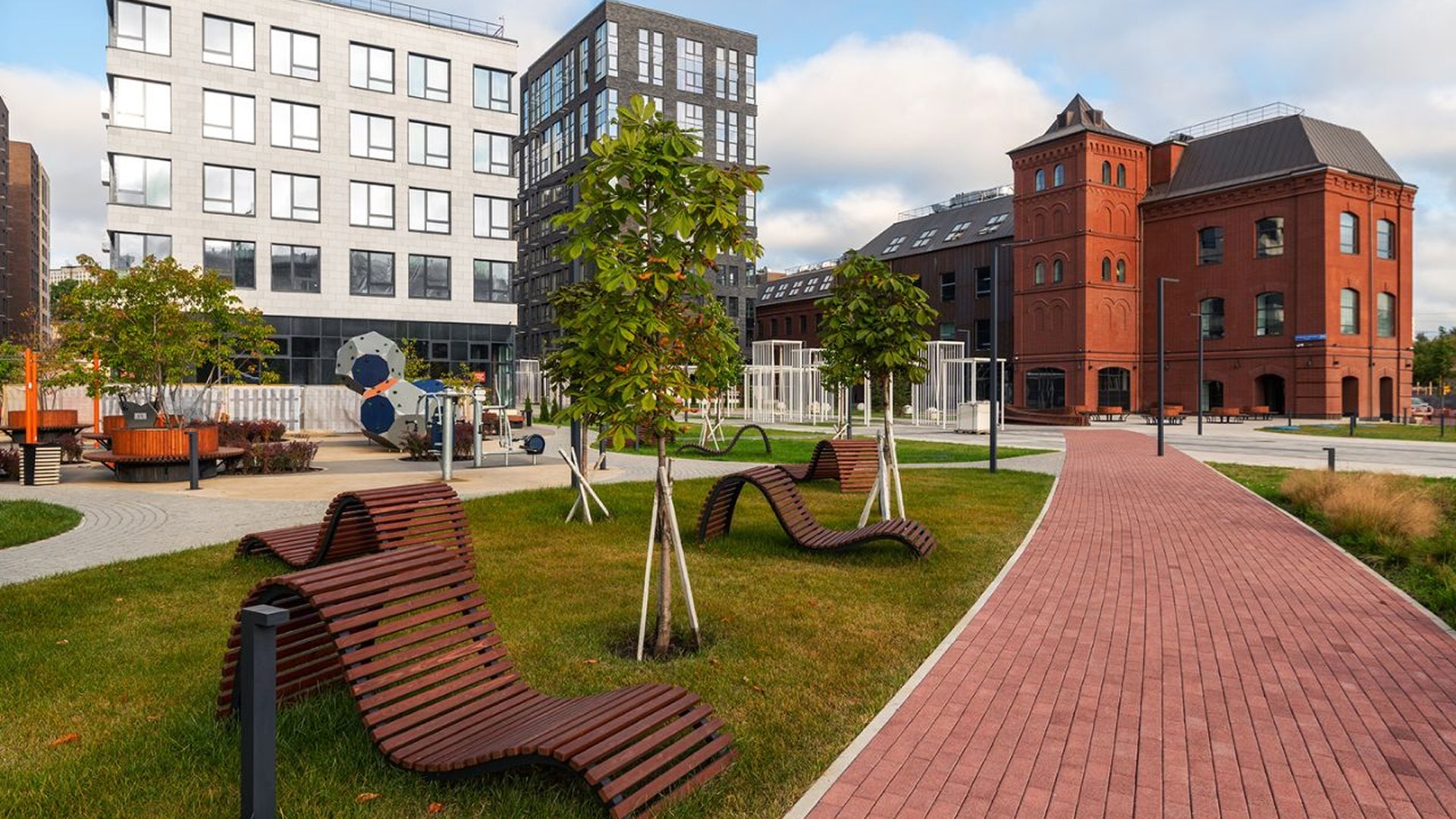 Фасады зданий оформлены натуральным камнем и панорамным остеклением, которое подчеркивает масштаб и динамику проекта. Дома переменной этажности образуют уютные закрытые дворы, обрамлённые зелёными зонами и сквером. Центральная ось квартала — просторный бульвар, который ведёт к площади с общественными и торговыми функциями.