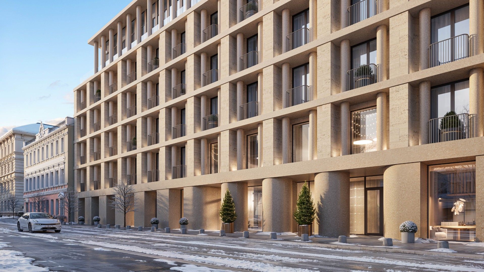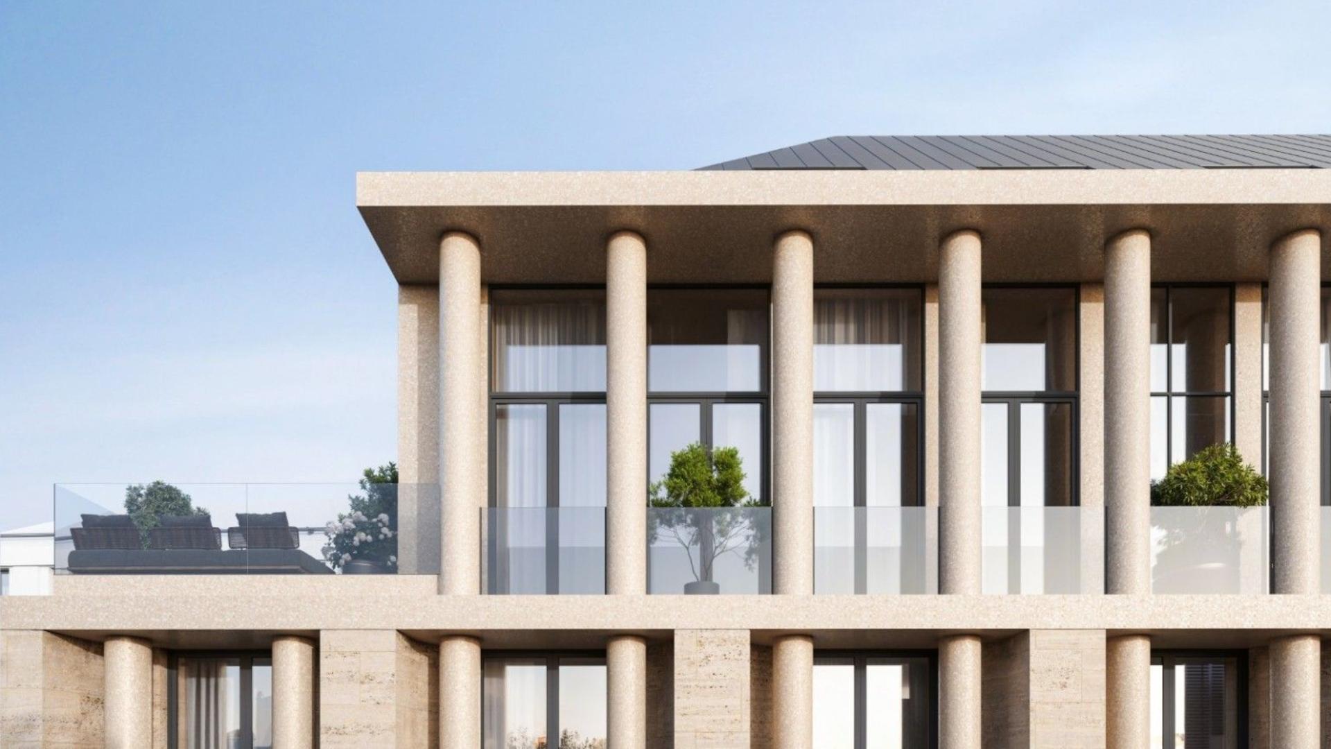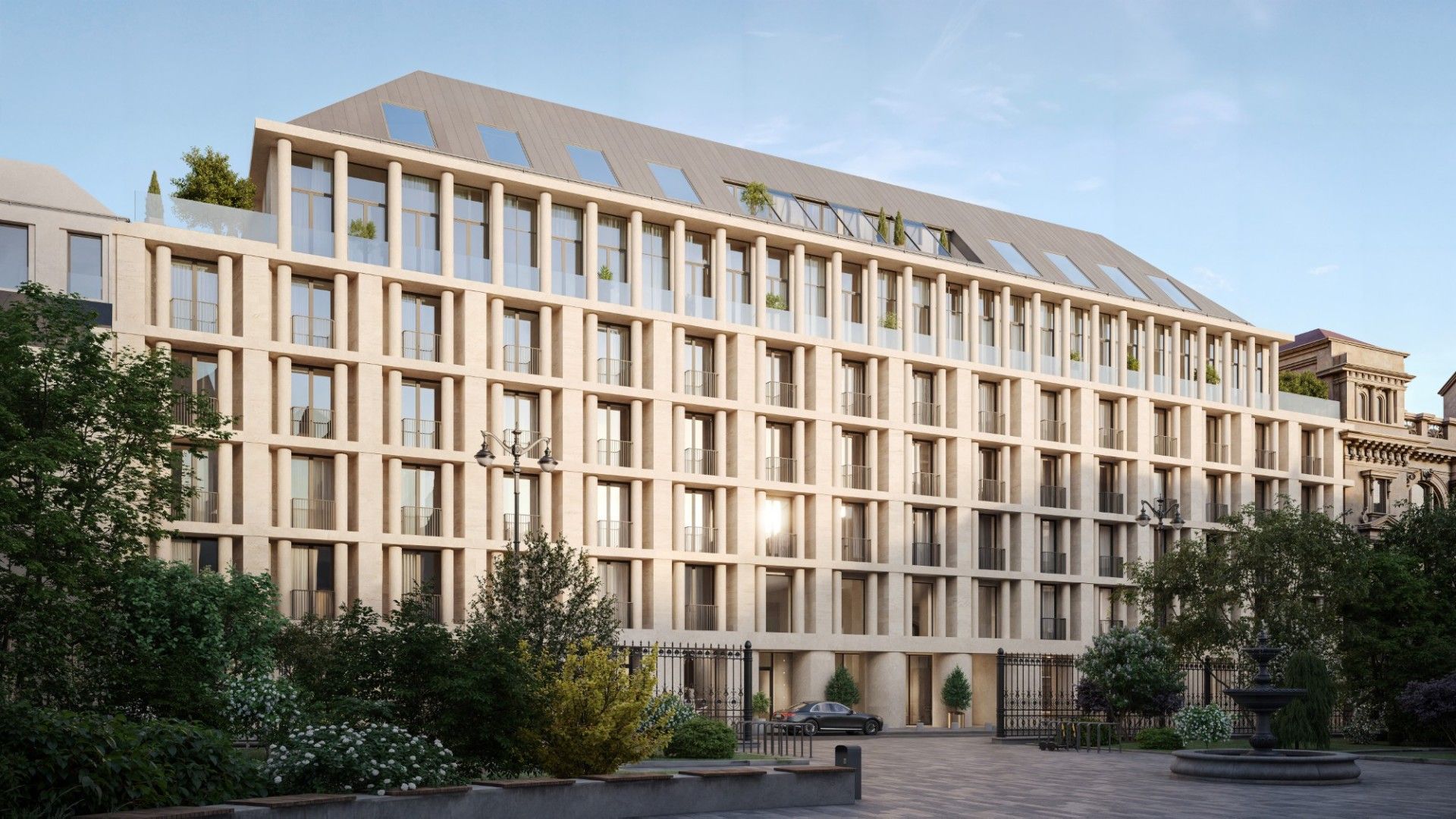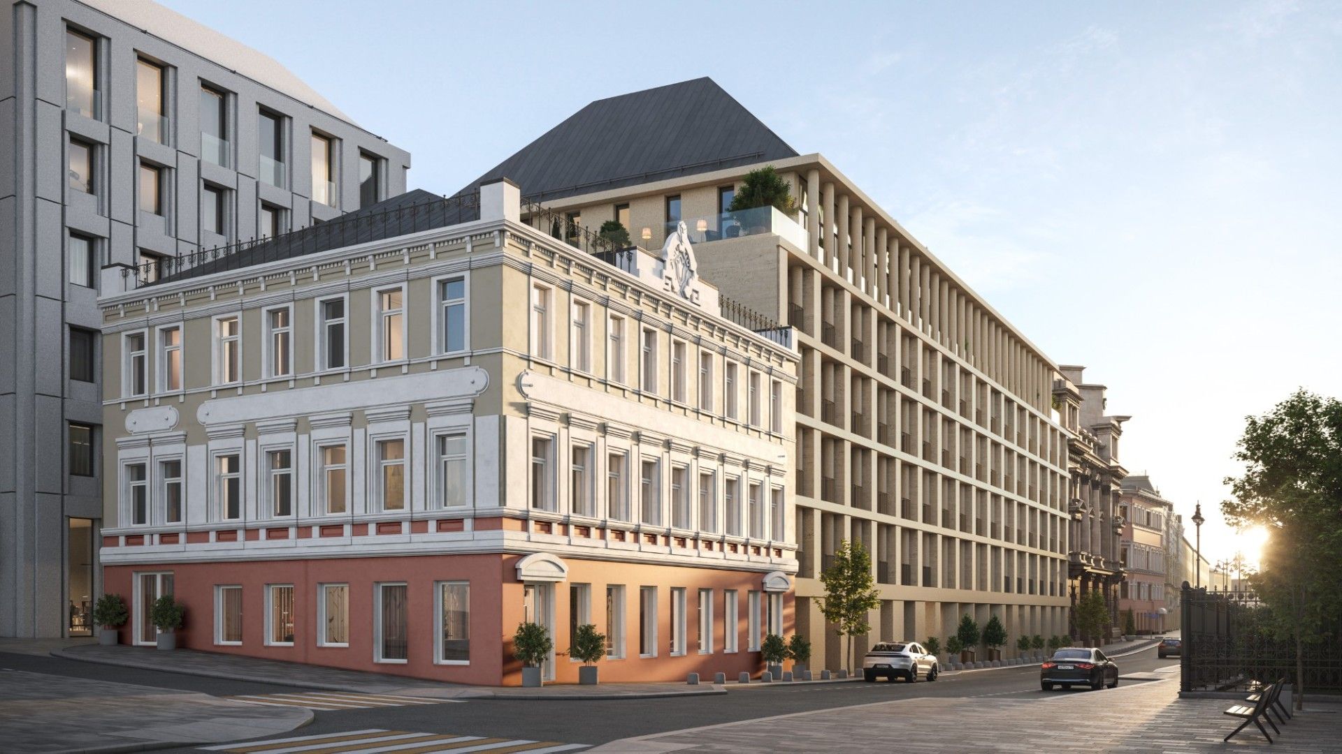 Здание выполнено в эстетике современного городского особняка: выдержанные линии, благородные материалы, продуманные фасады, гармонирующие с исторической средой. Дом выглядит дорого, но сдержанно — в духе настоящей европейской респектабельности.