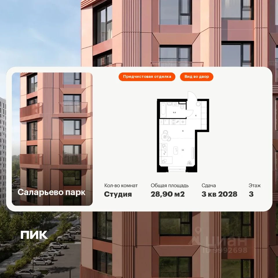 Продается студия квартира в ЖК Саларьево парк - по цене 9 996 510 ₽ от застройщика ПИК. Находится по адресу: Москва, Московский, Киевское шоссе возле метро Филатов луг в районе Сосенское. Общая площадь квартиры - 28.9 м². Этаж 3 из 23.