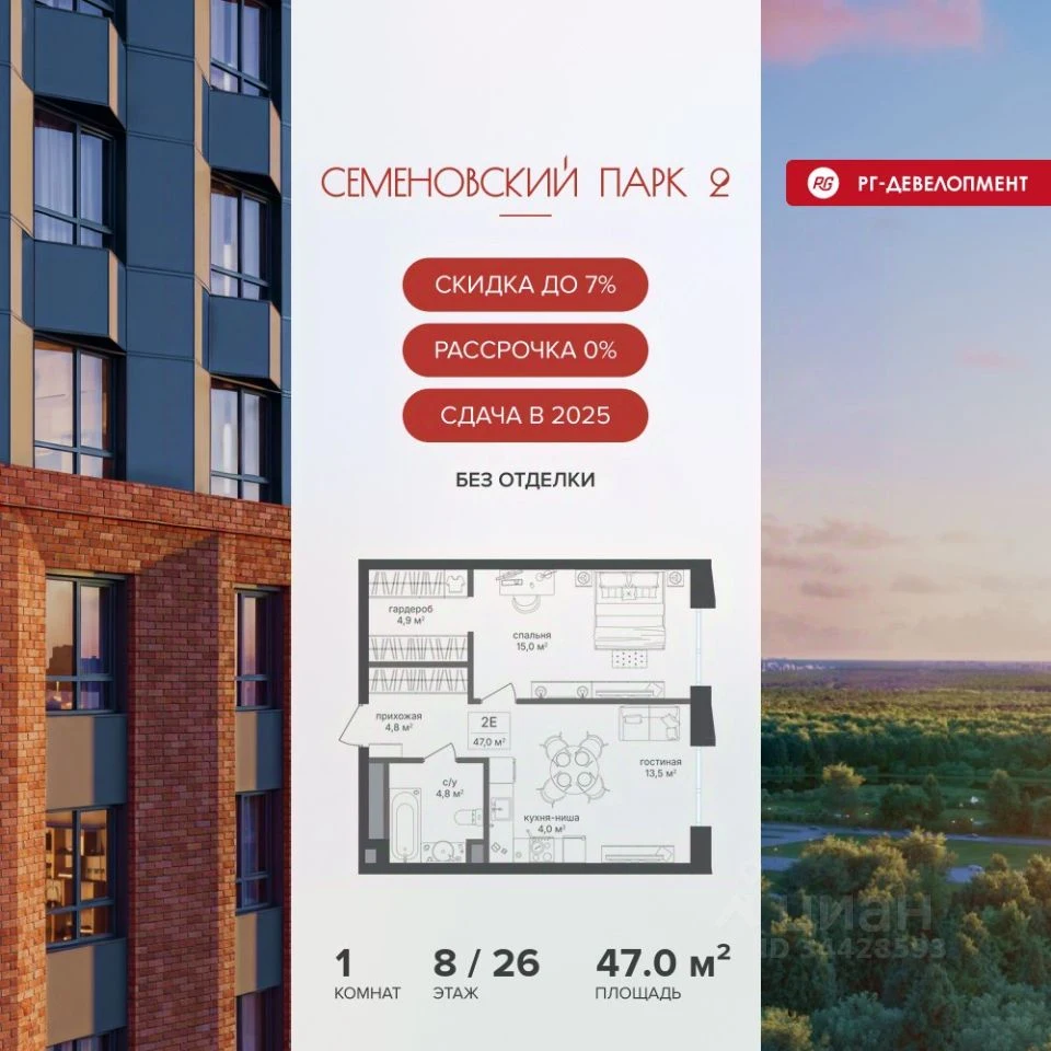 Продается 1-комнатная квартира в ЖК Семеновский парк 2 - по цене 18 095 940 ₽ от застройщика РГ-Девелопмент. Находится по адресу: Москва, 1-й Кирпичный пер., 17 возле метро Соколиная Гора в районе Соколиная гора. Общая площадь квартиры - 47 м². Этаж 8 из 26.