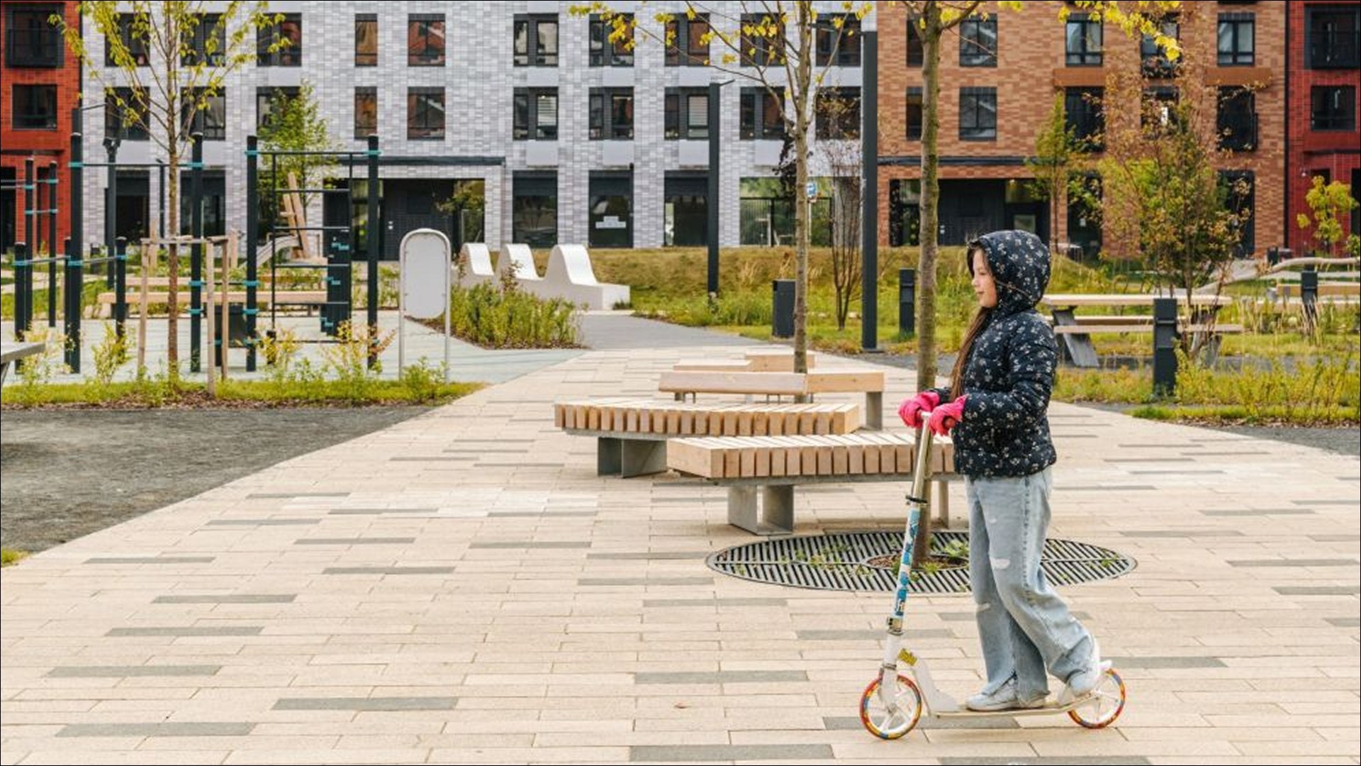 В составе жилого квартала уже действуют школа на 1100 учеников и детский сад на 325 мест. Запланировано строительство ещё одного детского сада, рассчитанного на 340 воспитанников. Пространство дворов включает игровые и спортивные зоны, зелёные насаждения, пешеходные маршруты и места для отдыха. Создано полноценное общественное пространство с велопарковкой, местами для общения и прогулок.