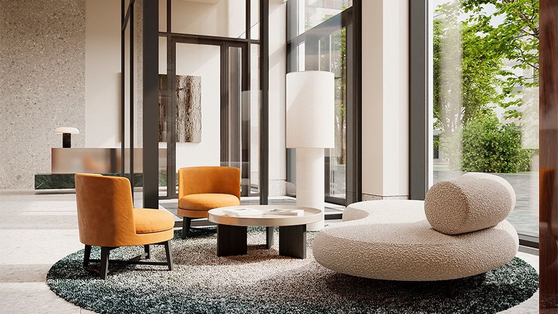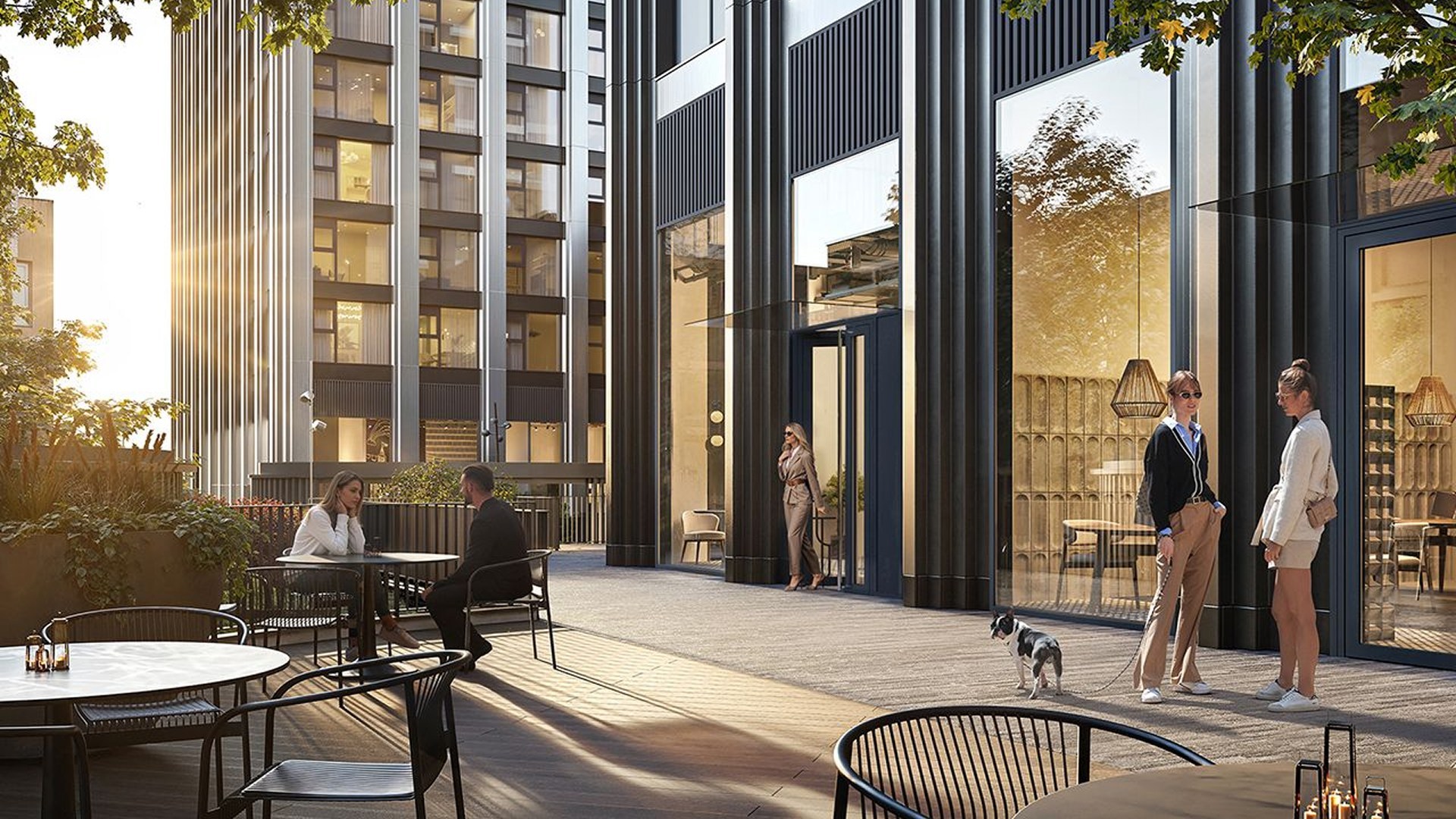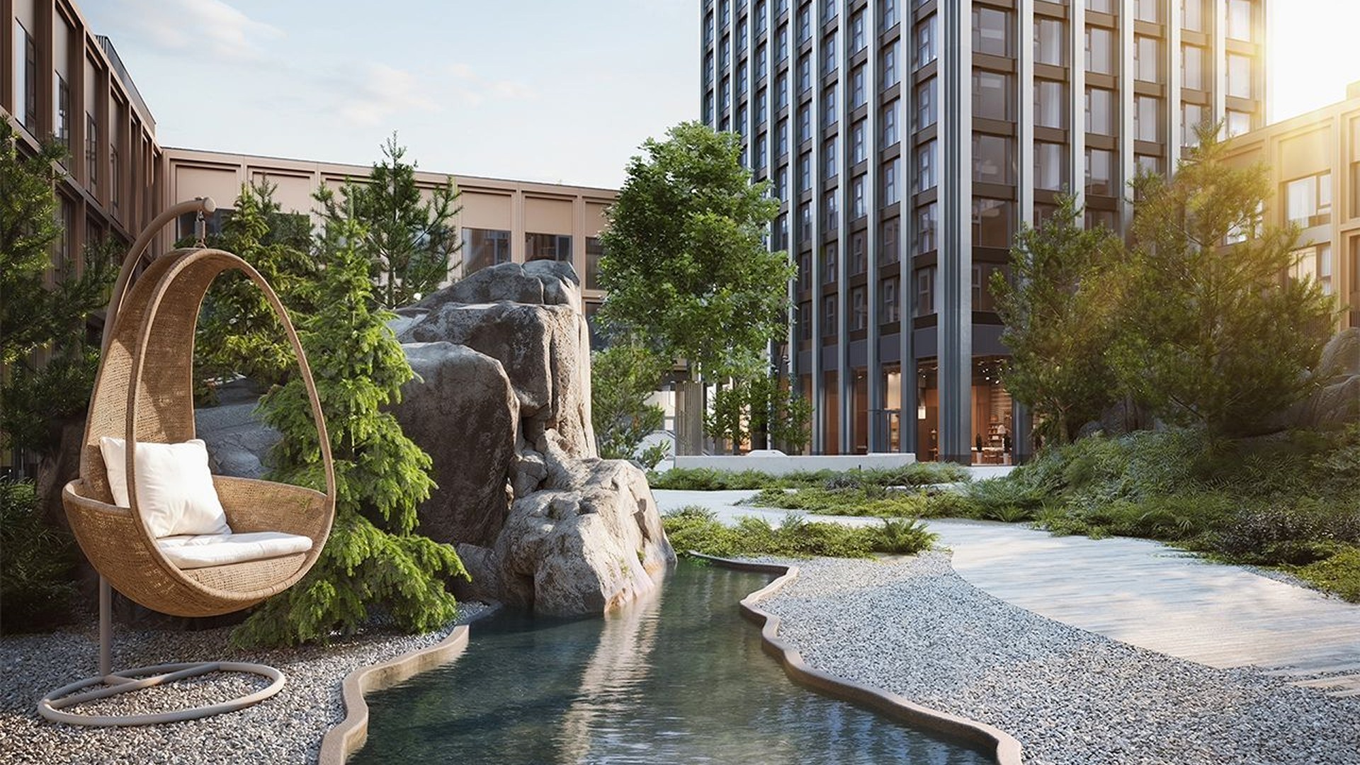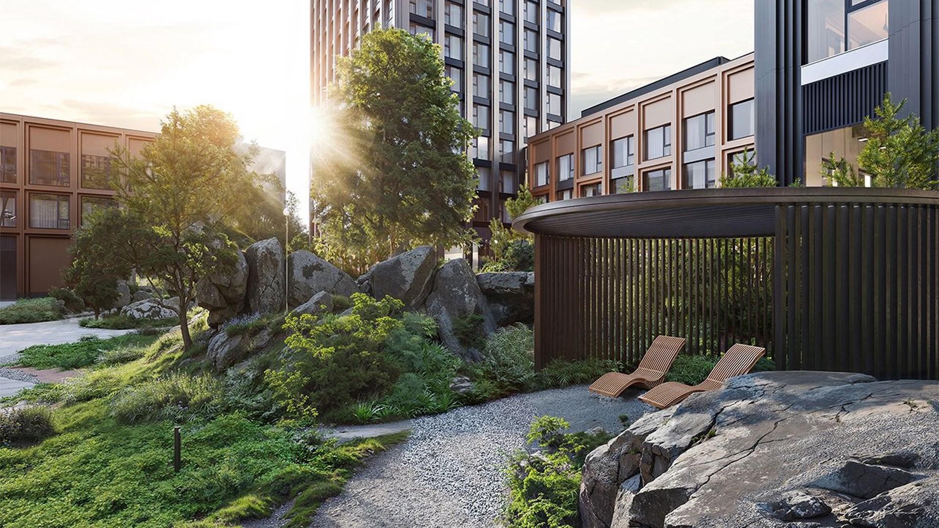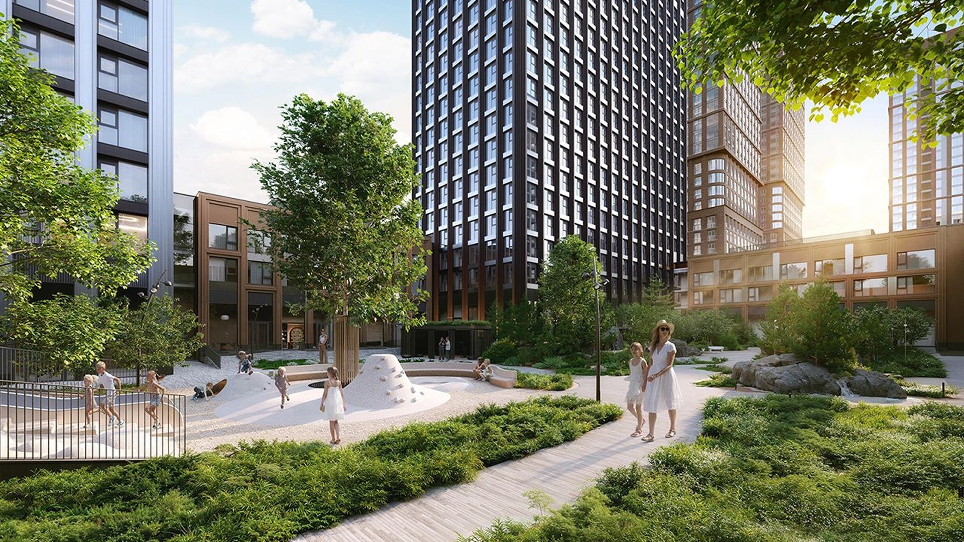 Закрытый двор спроектирован как лесной ландшафт с перепадами высот, шезлонгами, террасами, водоёмом, воркаут-зоной, площадкой для йоги и двухуровневой детской зоной. Подземный паркинг на 495 машиномест включает зарядки для электрокаров и сервисную зону. На территории появятся школа на 1500 мест, детский сад на 450 мест, фитнес с бассейном, культурный центр, медцентр, магазины и кафе.
