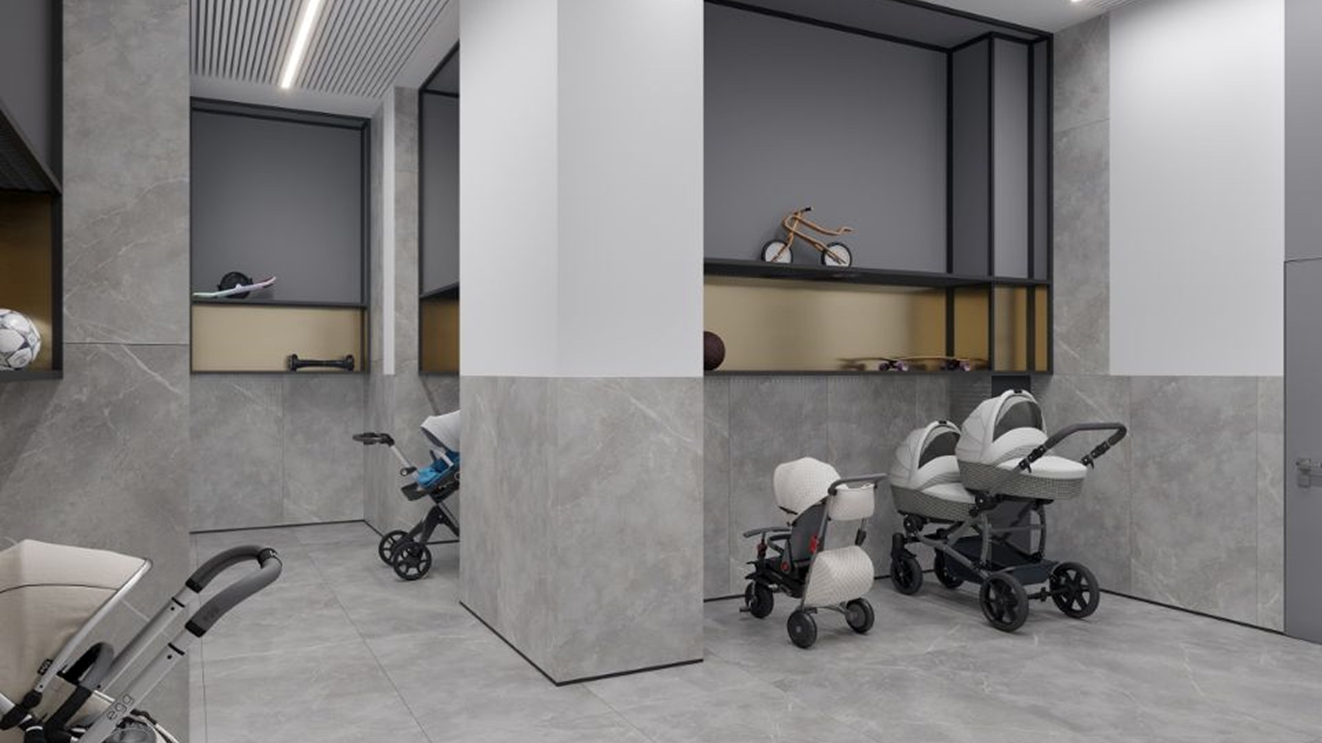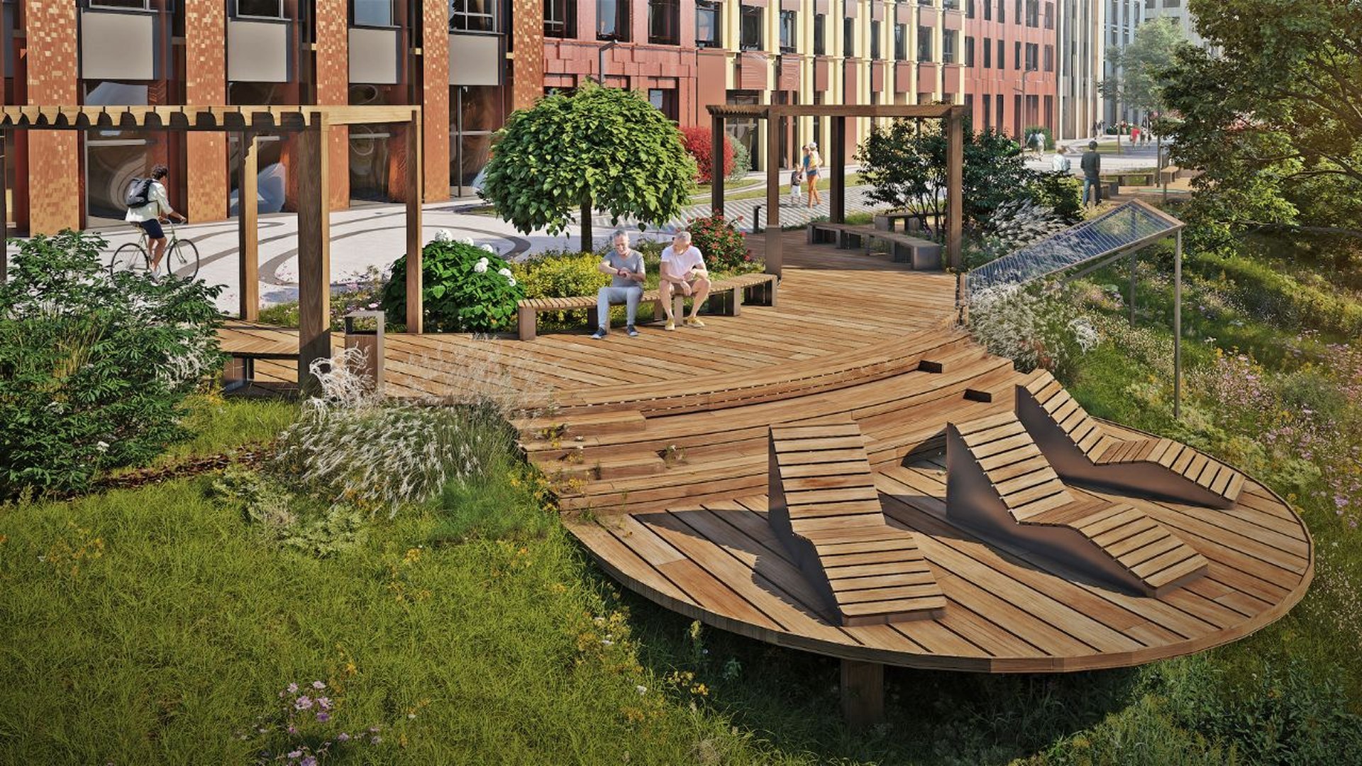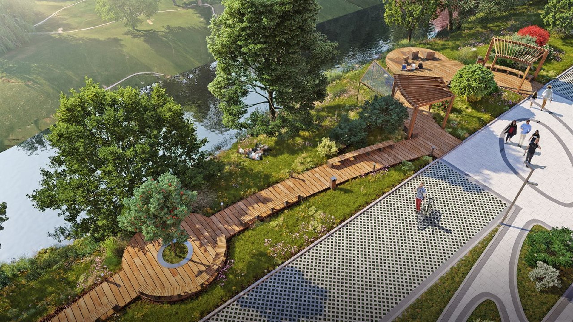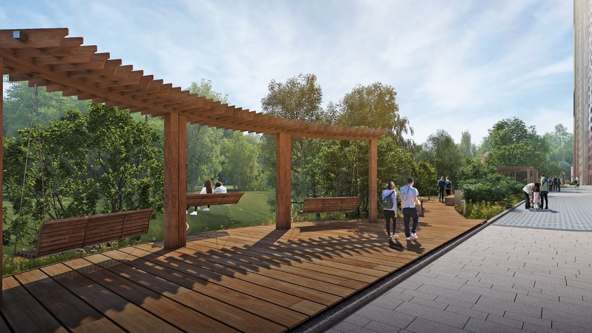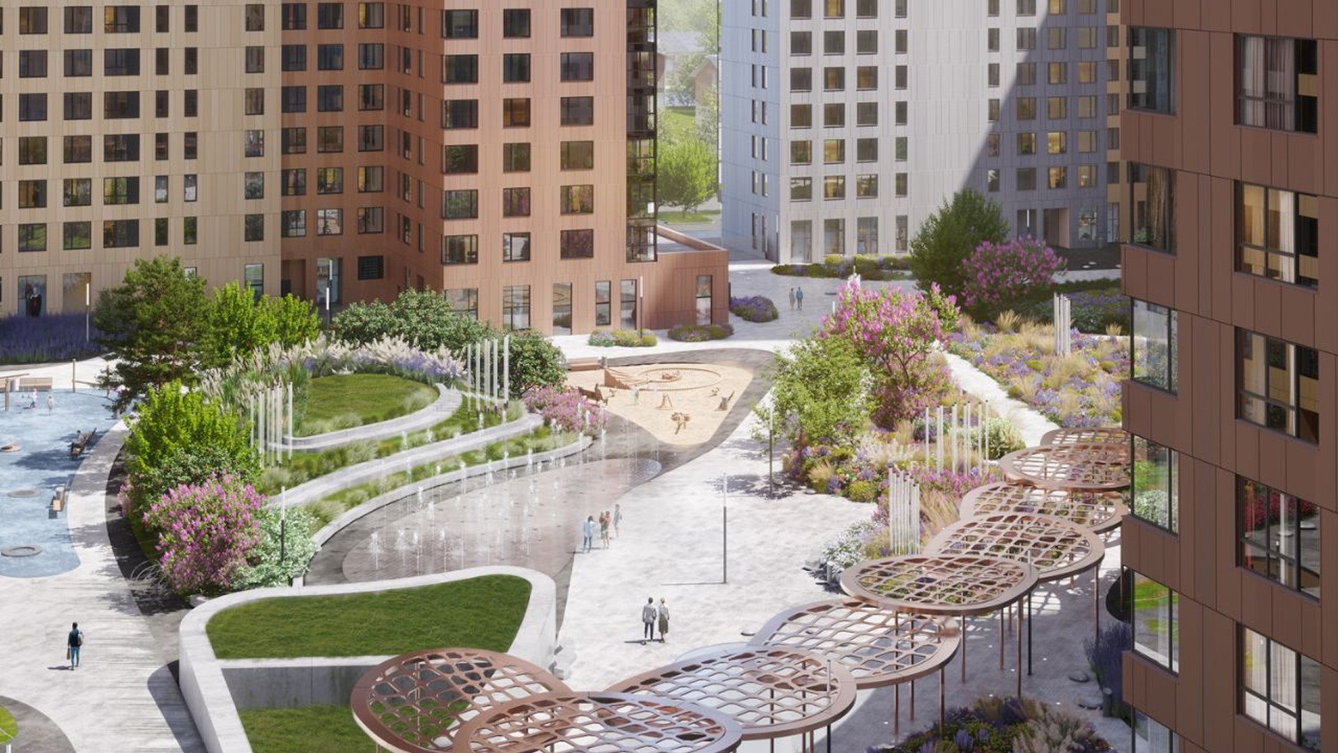 Закрытая территория комплекса включает собственный парк площадью 3,5 га с прогулочными маршрутами, детскими и спортивными зонами, фонтаном и местами для отдыха.