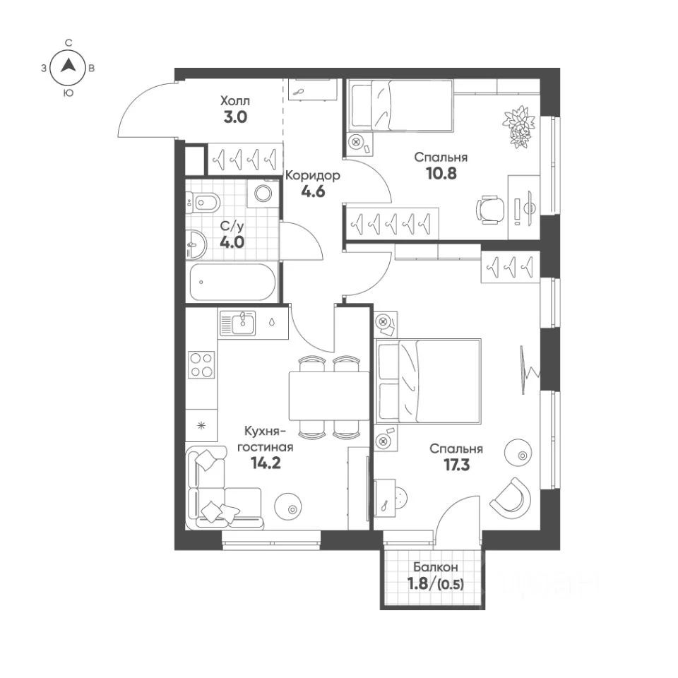 2-комнатная, 54.4 м², №114520
