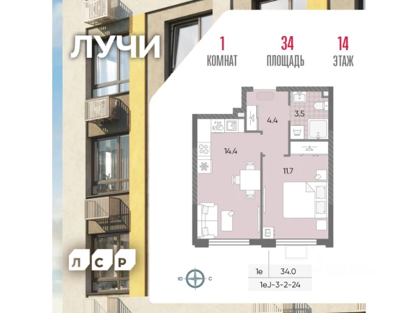 Однокомнатная квартира ЖК «Solos (Солос)», 31.11 м², №3016