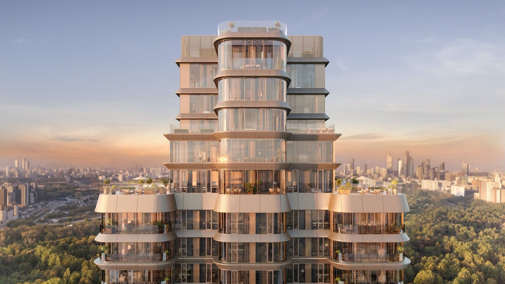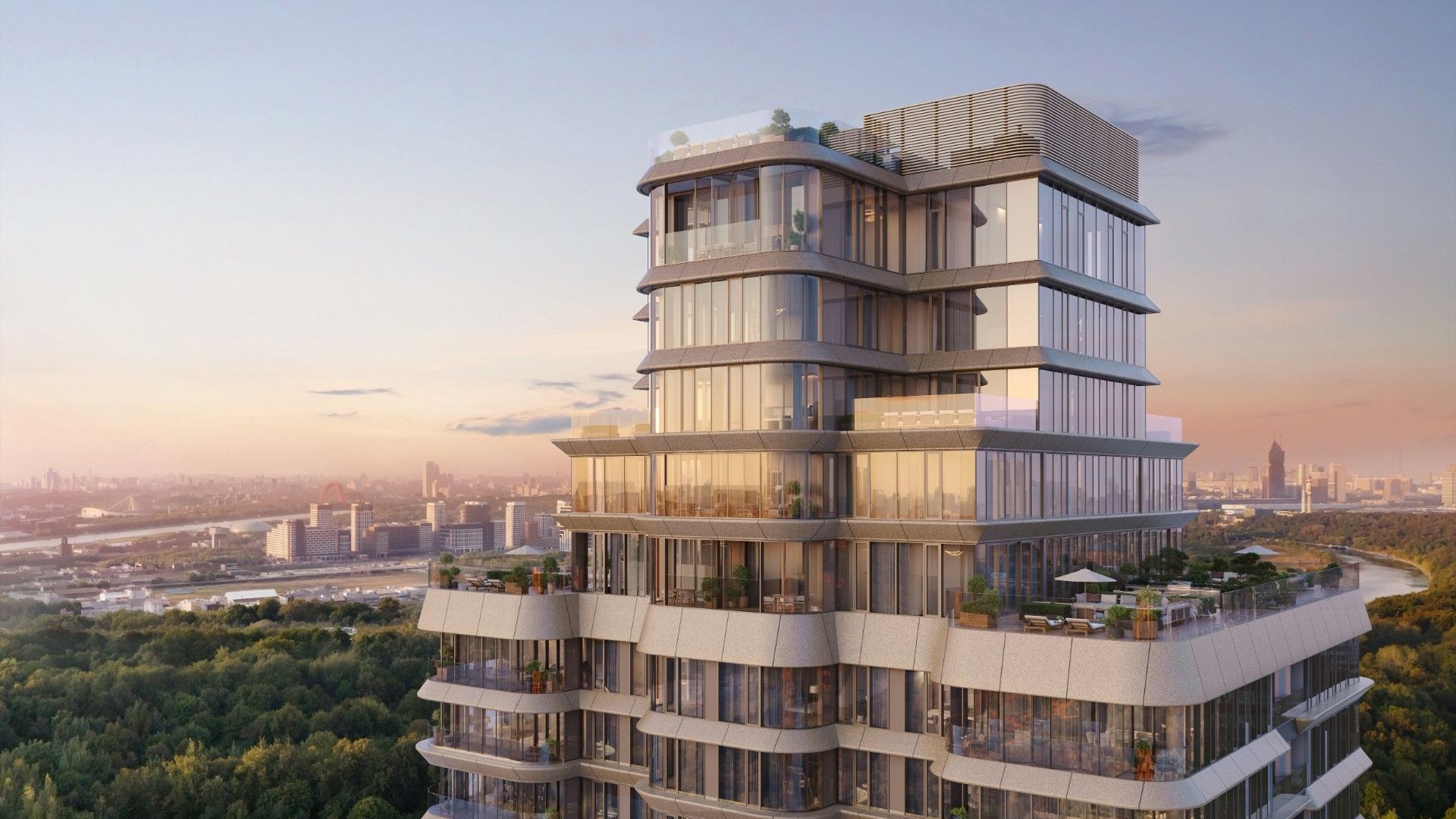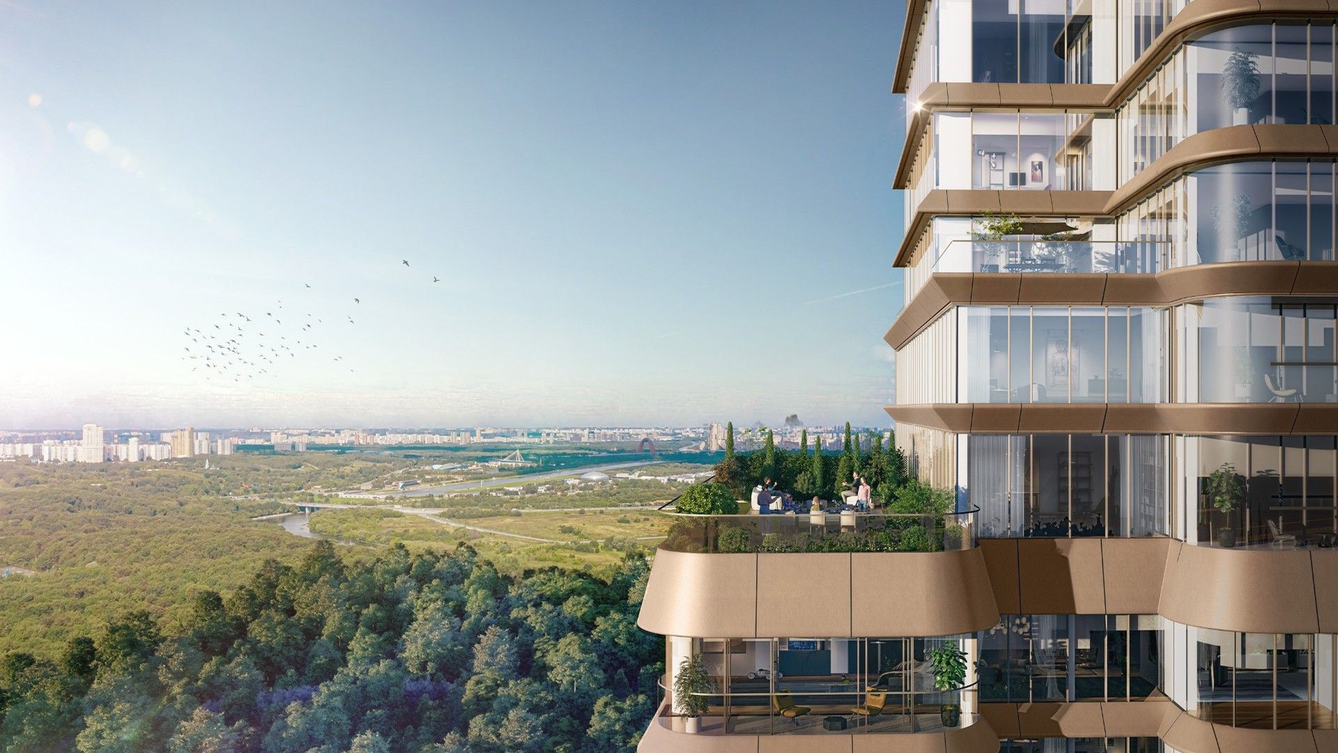 Здание выполнено в бионическом стиле с плавными формами и панорамным остеклением. Балконы-трансформеры адаптируются к сезону, превращаясь в террасы. Высота потолков — от 3,1 до 4,5 м, площадь квартир — от 70,8 до 356,5 м2. Предусмотрена чистовая и дизайнерская отделка с использованием натуральных материалов.