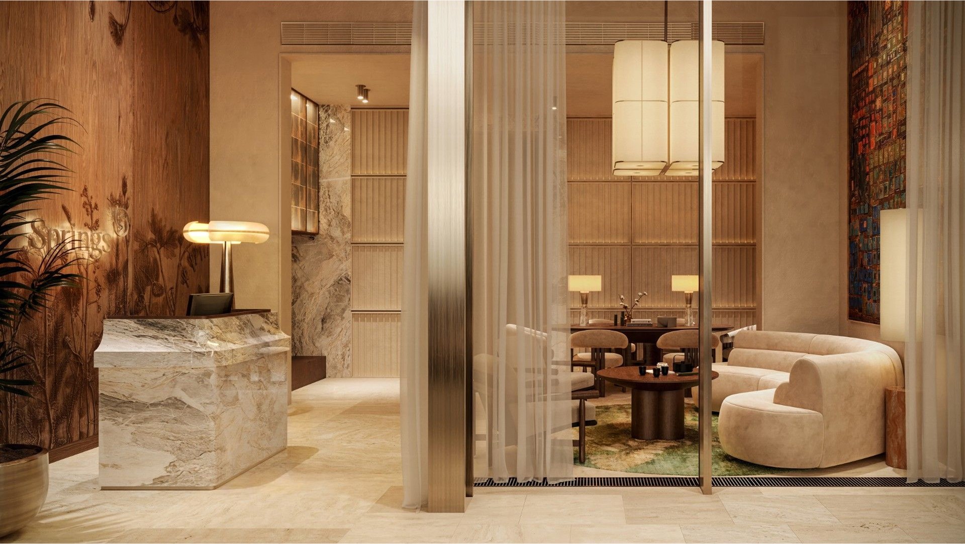 На первом этаже — wellness-центр с бассейном, хаммамом, массажными кабинетами и фитнес-зоной. Также здесь откроются ресторан, бьюти-пространство и лаундж-зоны. Во дворе — детская площадка, общественные террасы и благоустроенные прогулочные маршруты.