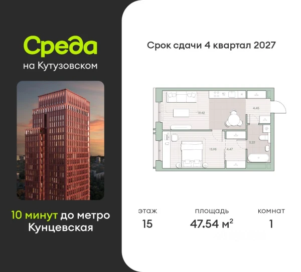 Однокомнатная квартира ЖК «Среда на Кутузовском» · 35.26 м²