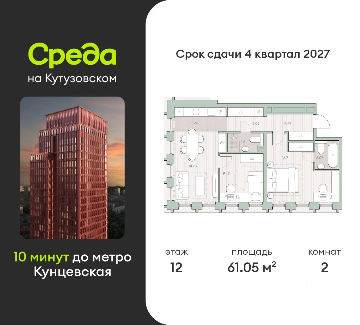 Продается 2-комнатная квартира в ЖК Среда на Кутузовском - по цене 32 100 090 ₽ от застройщика Среда. Находится по адресу: Москва, ул. Ивана Франко возле метро Кунцевская в районе Кунцево. Общая площадь квартиры - 61.05 м². Этаж 12 из 44.