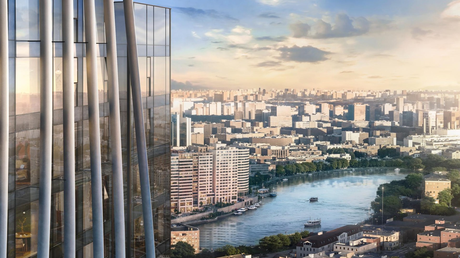 Это впечатляющий монолитно‑кирпичный небоскрёб высотой 43–46 этажей, ставший новой архитектурной доминантой района. В доме — 516 квартир с потолками от 3 до 4,4 м и панорамными окнами, открывающими живописные виды на Москву‑реку и городской пейзаж. Продуманная внутренняя среда сочетает современные технологии («Умный дом», центральное кондиционирование), безопасные закрытые дворы без машин, подземный паркинг и стильные общественные пространства — от фитнес‑рума до event‑lounge. Благоустройство и внимание к деталям создают атмосферу комфортного городского проживания в ритме современной Москвы.
