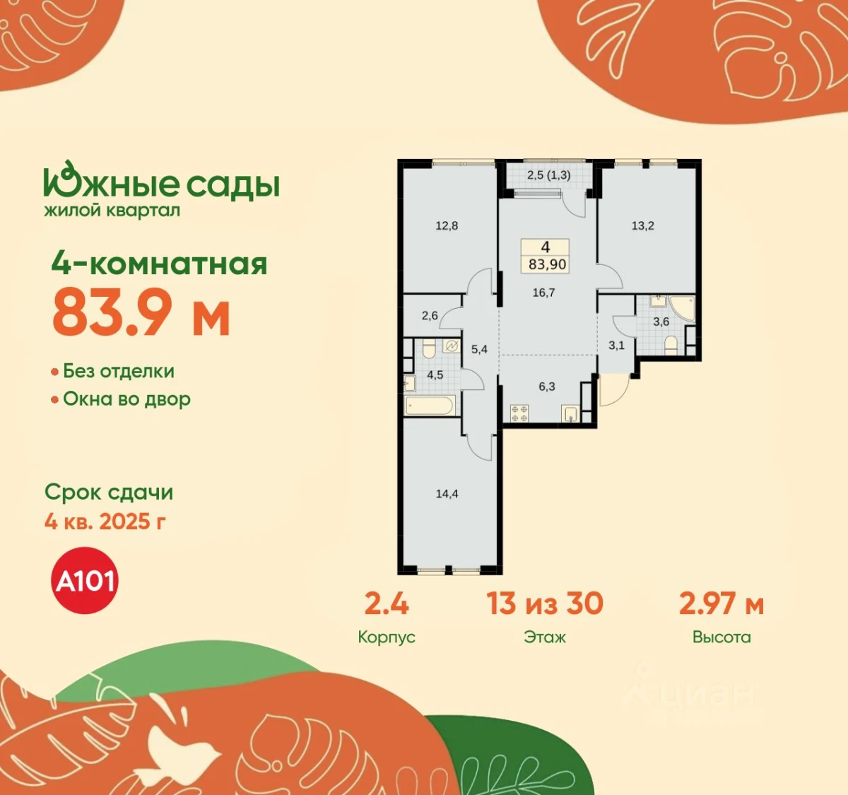 Продается 4-комнатная квартира в ЖК Южные сады - по цене 24 976 191 ₽ от застройщика А101. Находится по адресу: Москва, Бартеневская улица возле метро Улица Горчакова в районе Южное Бутово. Общая площадь квартиры - 83.9 м². Этаж 13 из 30.