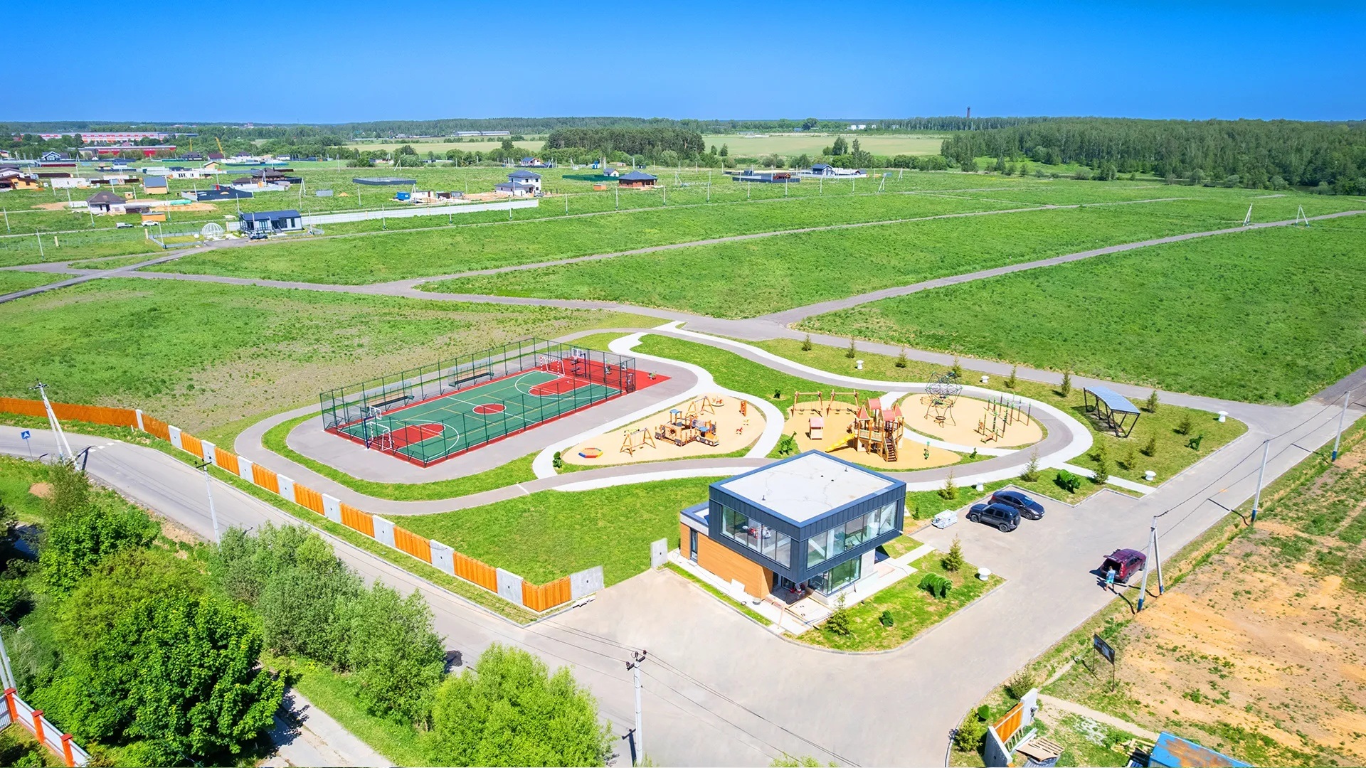 Безопасность территории обеспечивается закрытым периметром и КПП с автоматическим шлагбаумом, управление которым осуществляется дистанционно. Внутреннее устройство включает современные детские игровые площадки, универсальные спортивные зоны, гостевой паркинг и организованную площадку для сбора ТБО. Время в пути от МКАД при средней загрузке трасс составляет около 40–50 минут. В 10 минутах езды расположена ж/д станция Барыбино (Павелецкое направление), до которой можно добраться на общественном транспорте.