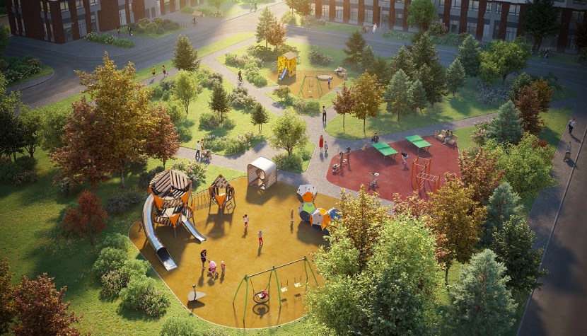 Во дворе-парке – тренажеры для взрослых и игровые площадки для детей разных возрастов. Площадь открытых пространств увеличена за счет подземной автостоянки.